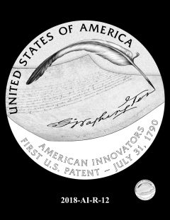 2018-AI-R-12 features an artist’s conception of the first patent that was issued on July 31st, 1790. President George Washington, whose signature is boldly depicted below, has just signed the document as noted by the quill pen. The design also features the inscriptions "United States of America," "American Innovators," and "First U.S. Patent – July 31, 1790."
