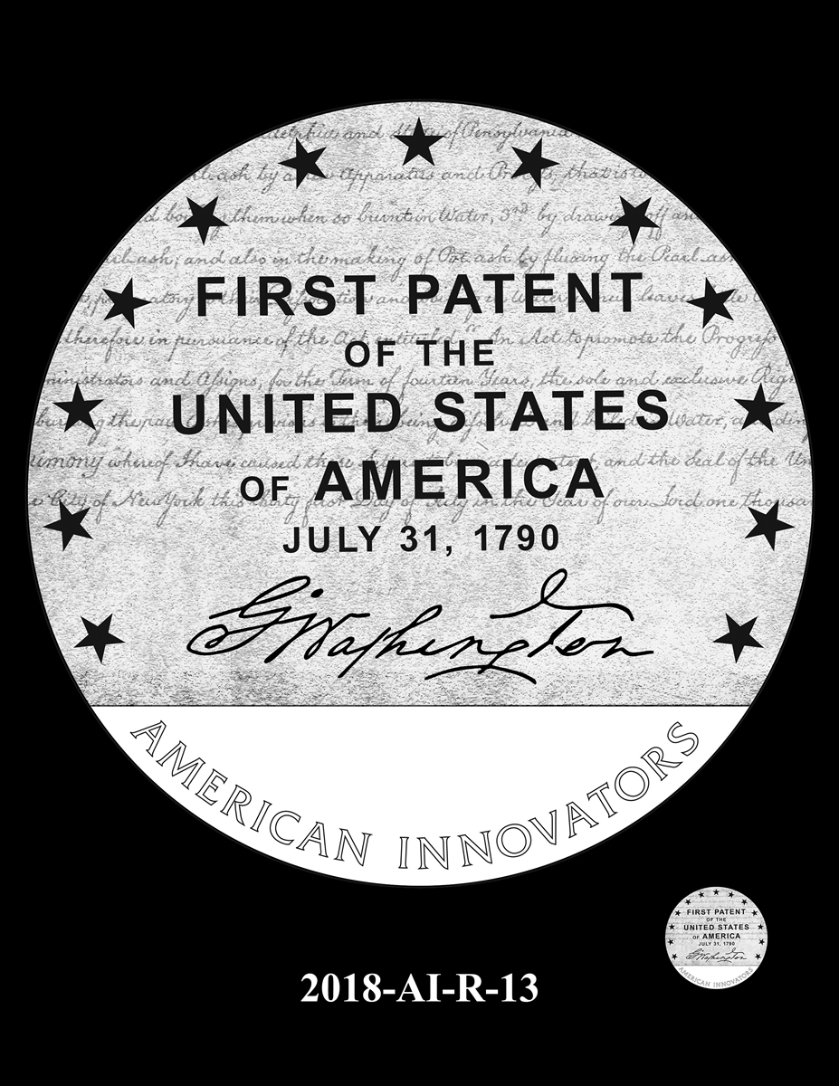 2018-AI-R-13 depicts a document representing the first U.S. patent issued, featuring a bold depiction of George Washington’s signature. The 13 stars along the rim represent the 13 states in existence in 1790. The design also features the inscriptions "First Patent of the United States of America," "July 31, 1790," and "American Innovators."