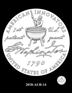 2018-AI-R-14 depicts George Washington’s signature under a man stirring a pot. This represents the first U.S. patent, which advanced changes in the production of potash and pearl ash, considered the first industrial chemical. The design also features the inscriptions "American Innovators," "First U.S. Patent Grant," "1790," and "United States of America."