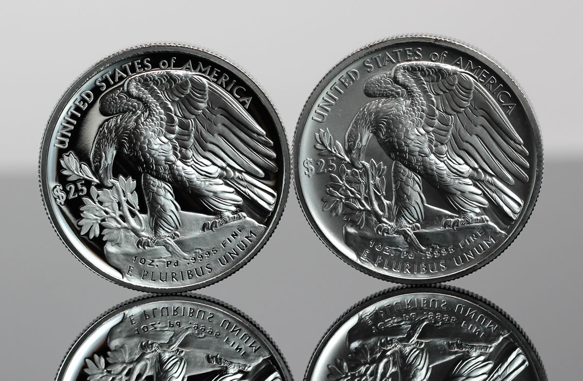 The two photos below highlight differences between proof and bullion Palladium Eagles.