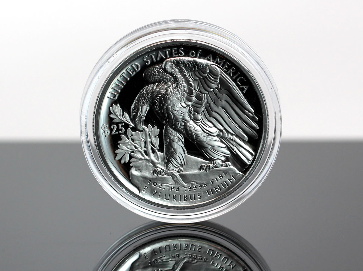 Public Law 111-303 authorizes the Secretary of the Treasury to strike and issue palladium coins on an annual basis. The palladium coin joins three other American Eagle products — the American Silver Eagle, the American Gold Eagle and the American Platinum Eagle. The palladium coin’s size is nearest the 1 oz. Gold Eagle. No other coins in the series match its thickness.