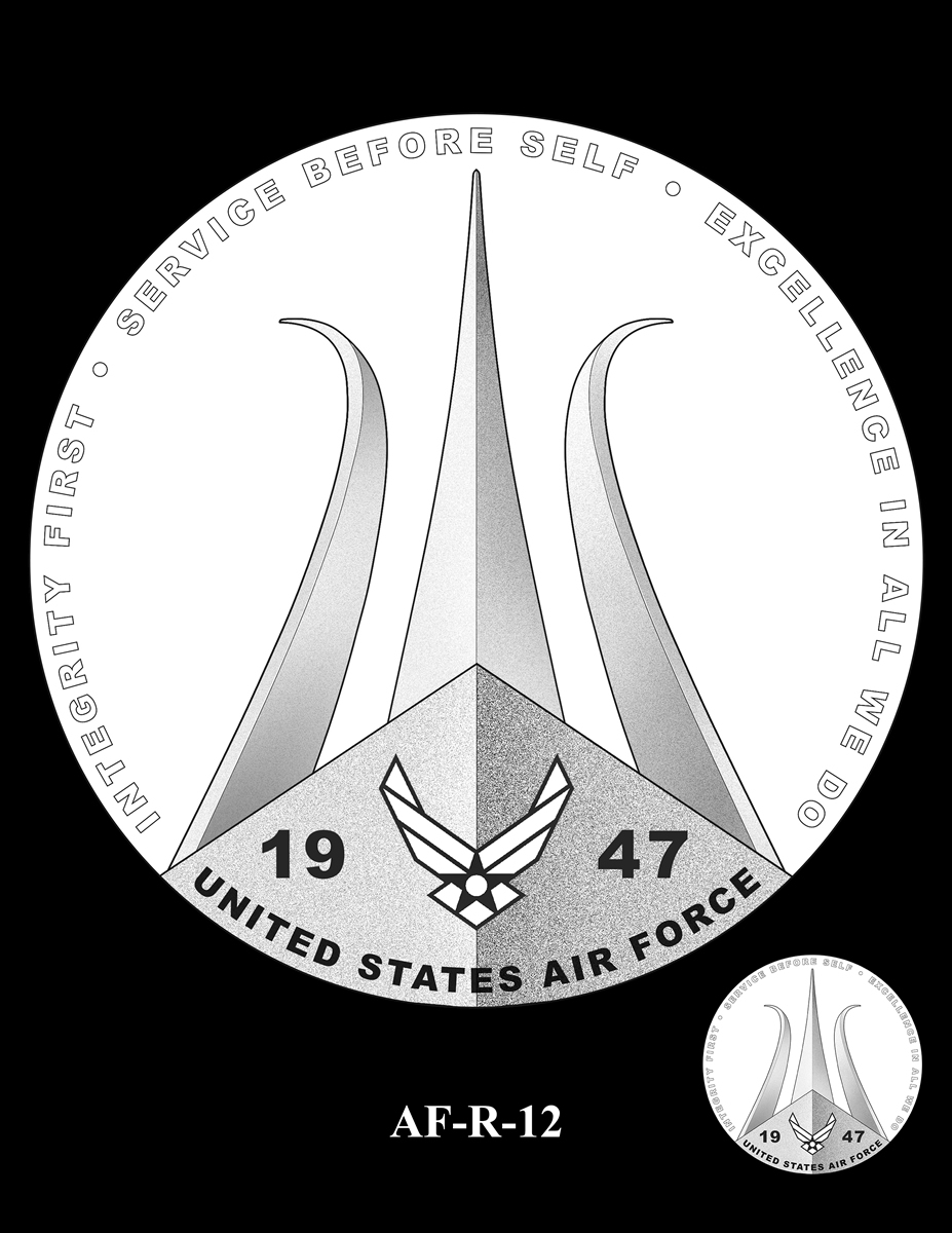 AF-R-12 depicts the Air Force Memorial as seen from the sculpture’s base looking skyward to its three spires. The design emphasizes the significance of the three core values of the Air Force. The inscriptions "INTEGRITY FIRST," "SERVICE BEFORE SELF," "EXCELLENCE IN ALL WE DO," "UNITED STATES AIR FORCE," and the date "1947" encircle the design.