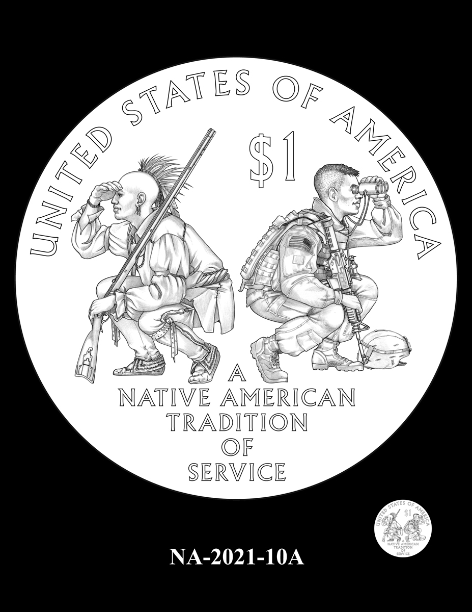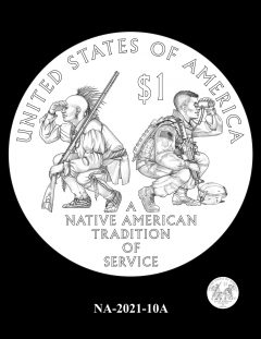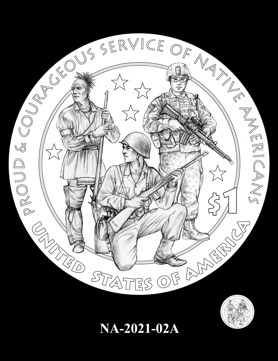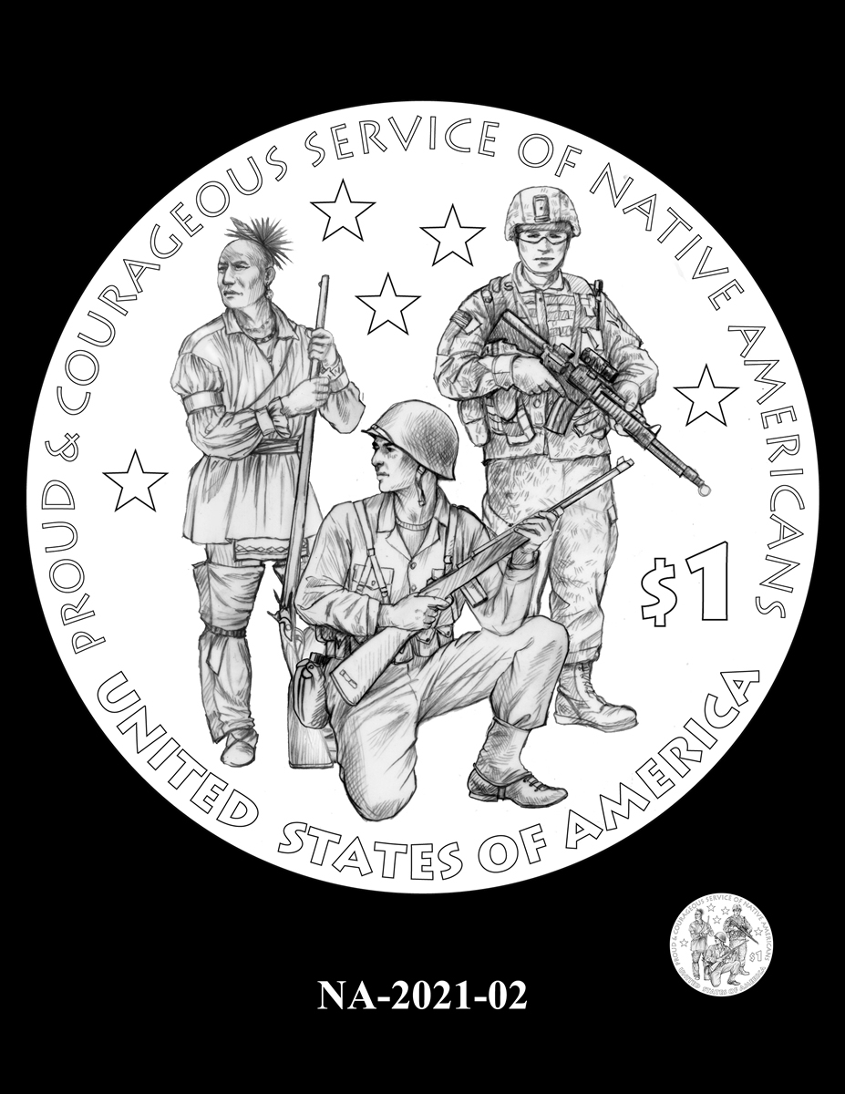 NA-2021-02 and NA-2021-02A depict three soldiers representing Native Americans who fought in the American Revolutionary War through to the current day. Two soldiers from the past look back, while the modern soldier looks forward. Five stars represent branches of the military forces: Army, Navy, Air Force, Marines and Coast Guard. In NA-2021-02A, the circle (often called the sacred circle) is emblematic of many things in many Native American cultures, with the common thread being the living world in balance with no beginning and no end. Both designs feature the additional inscription "Proud & Courageous Service of Native Americans."