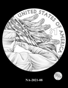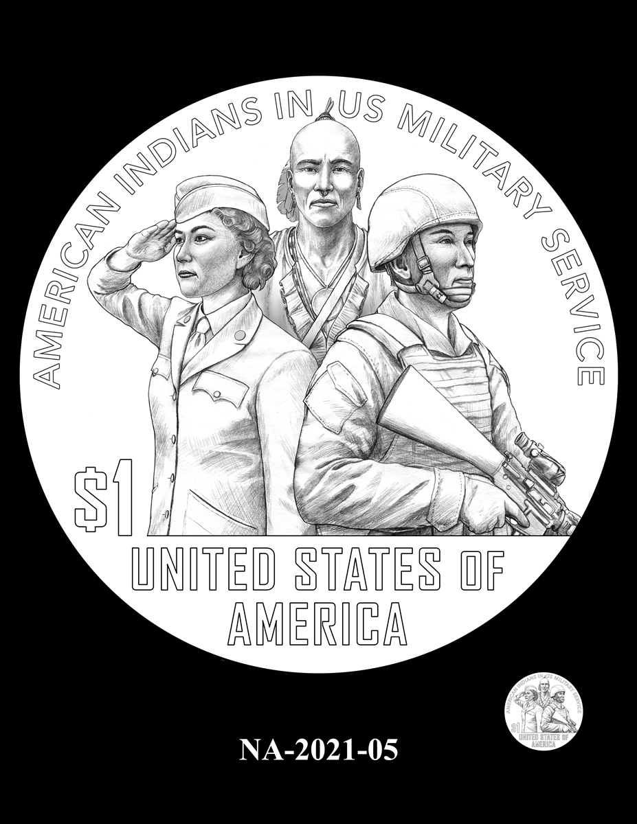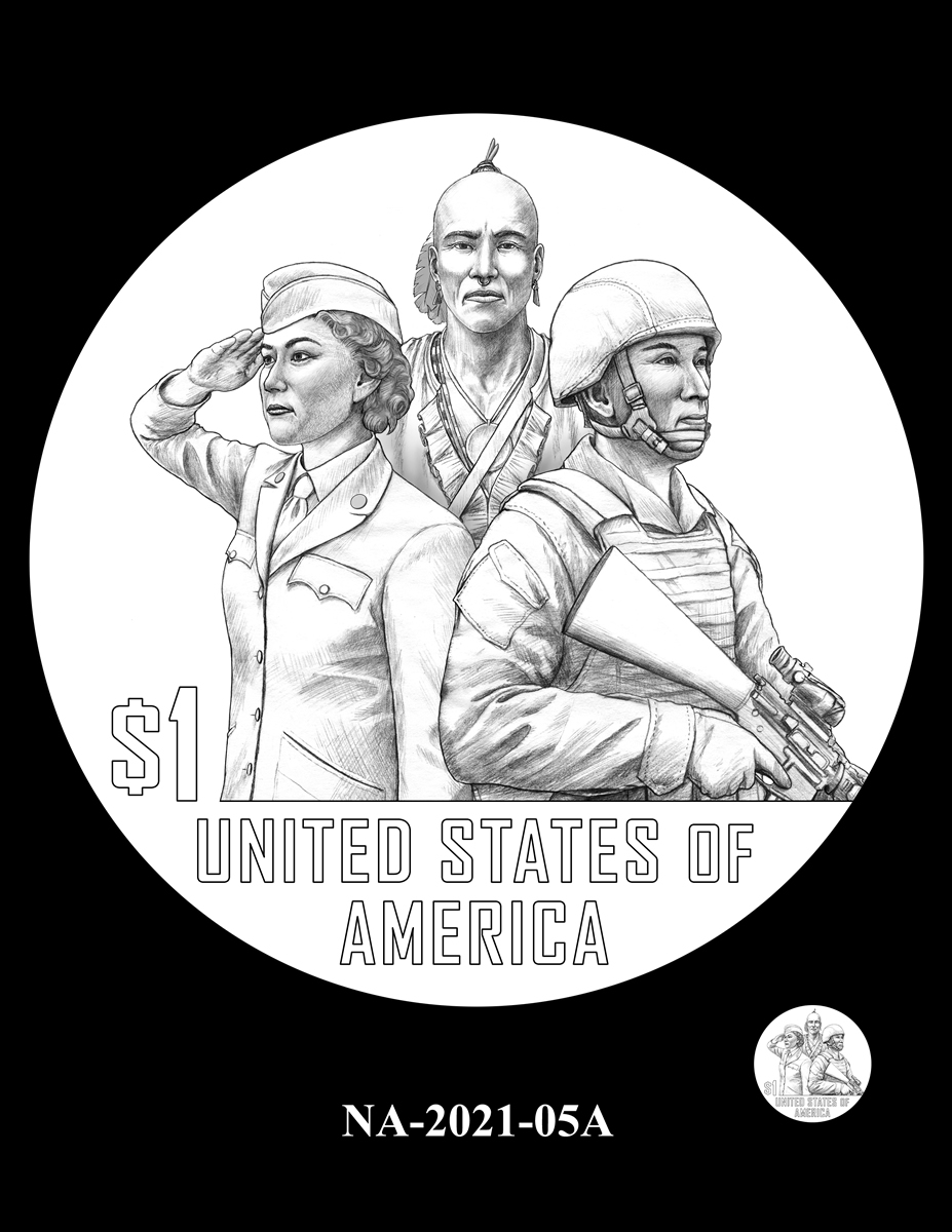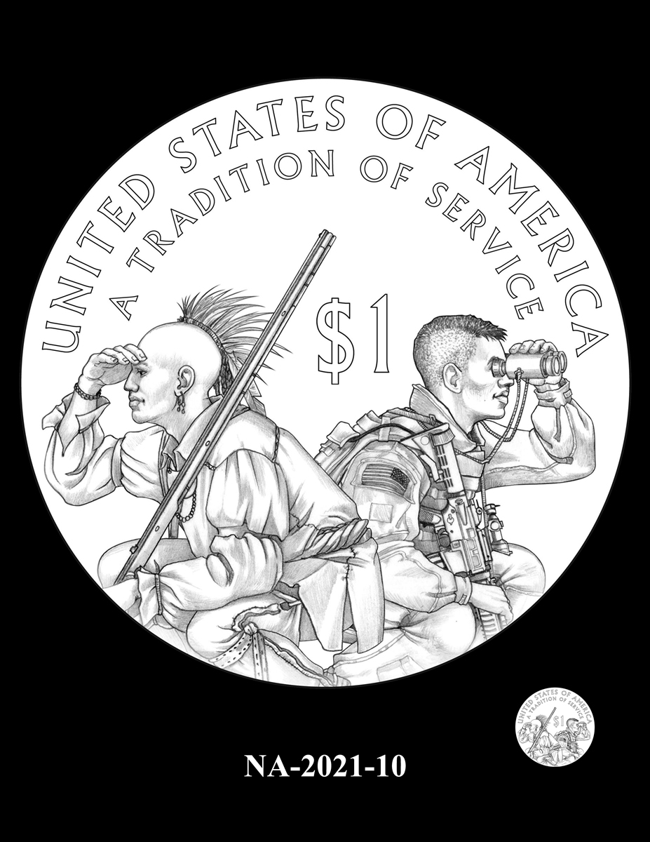 NA-2021-02 and NA-2021-02A depict three soldiers representing Native Americans who fought in the American Revolutionary War through to the current day. Two soldiers from the past look back, while the modern soldier looks forward. Five stars represent branches of the military forces: Army, Navy, Air Force, Marines and Coast Guard. In NA-2021-02A, the circle (often called the sacred circle) is emblematic of many things in many Native American cultures, with the common thread being the living world in balance with no beginning and no end. Both designs feature the additional inscription "Proud & Courageous Service of Native Americans."