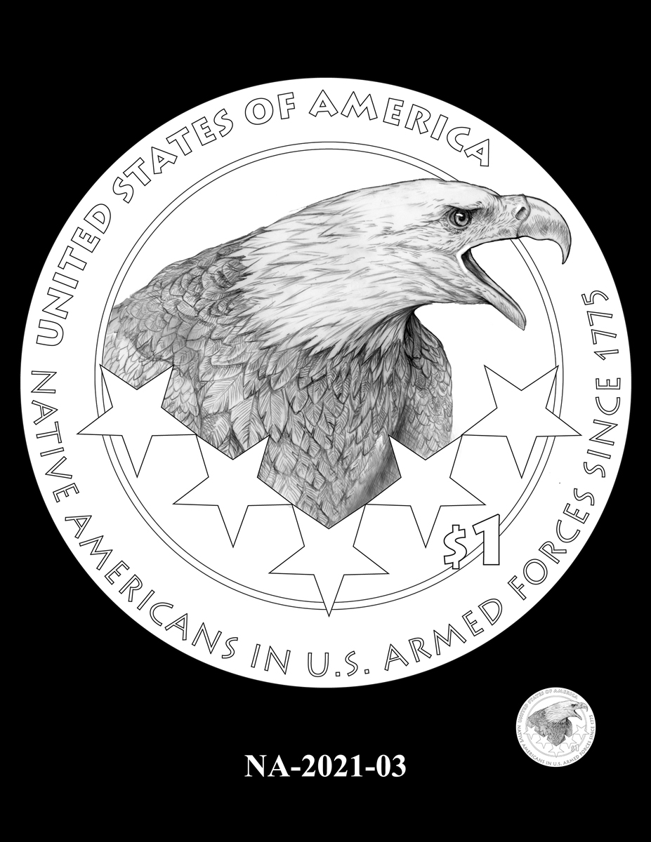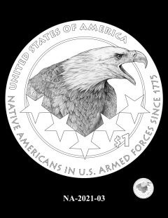 NA-2021-03 features an eagle, which is highly revered and considered sacred in Native American culture. Here, the eagle serves as a symbol of the values and abilities of Native American service members, and the high regard held for that service. Symbolic elements of five stars and a circle define the outline of the eagle. Included in the design is the additional inscription "Native Americans in U.S. Armed Forces Since 1775."