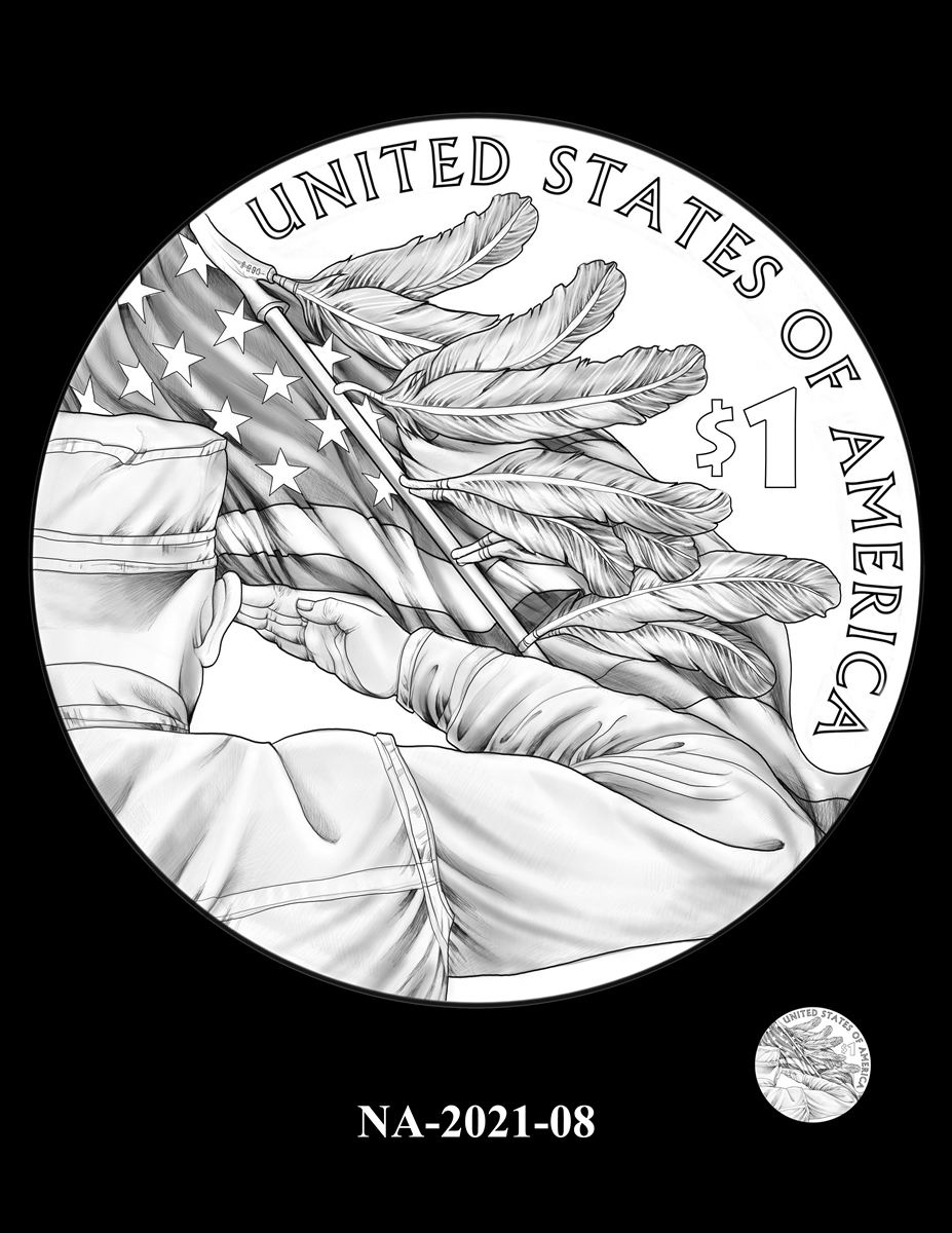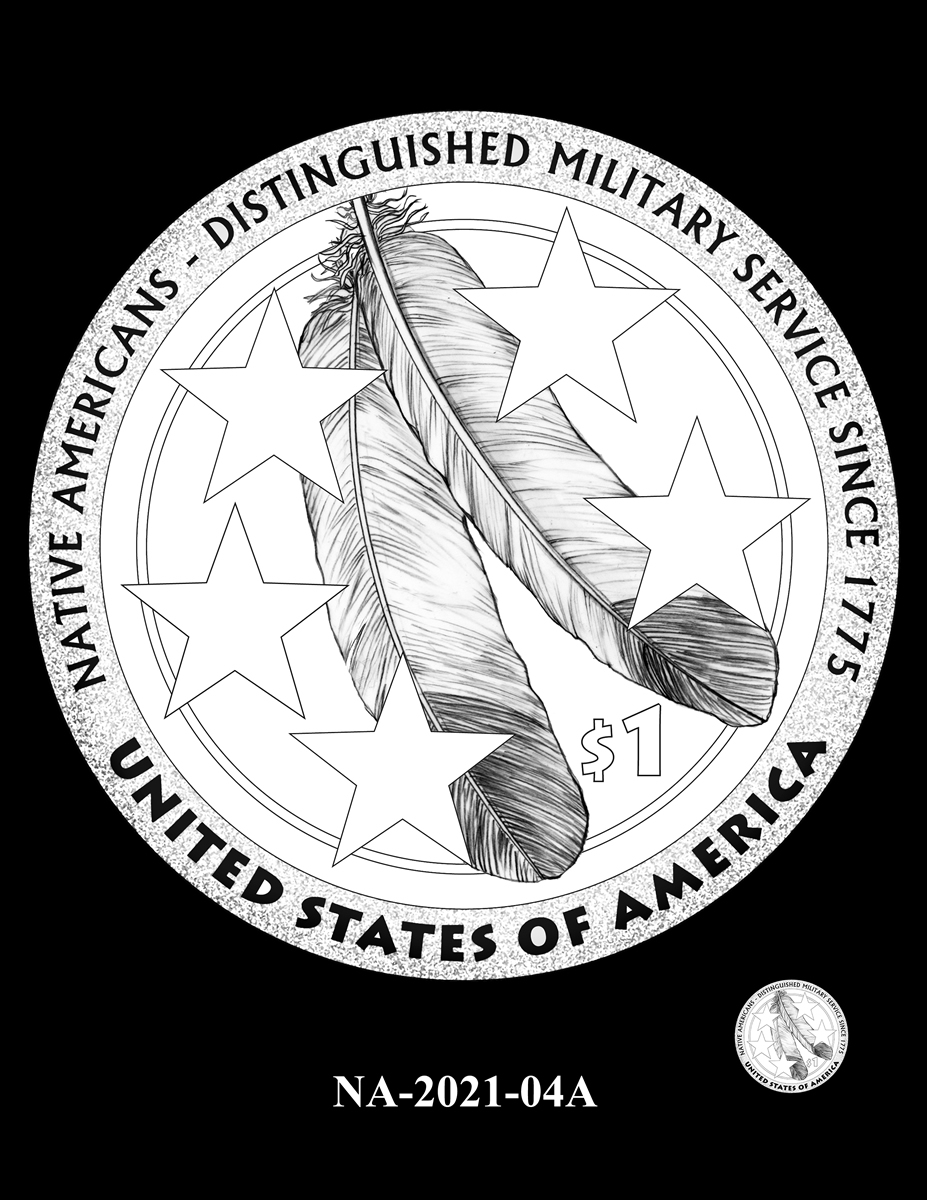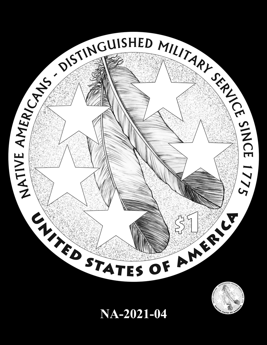 NA-2021-04 and NA-2021-04A feature eagle feathers, which were traditionally earned in battle or by performing a brave deed. Eagle feathers are revered and respected, receiving the utmost care and handling, and are to be displayed proudly in homes. Stars representing five branches of the U.S. Military are in the foreground, while in NA-2021-04A a circle provides an additional reference to Native Americans. Included in the designs is the additional inscription "Native Americans — Distinguished Military Service Since 1775."