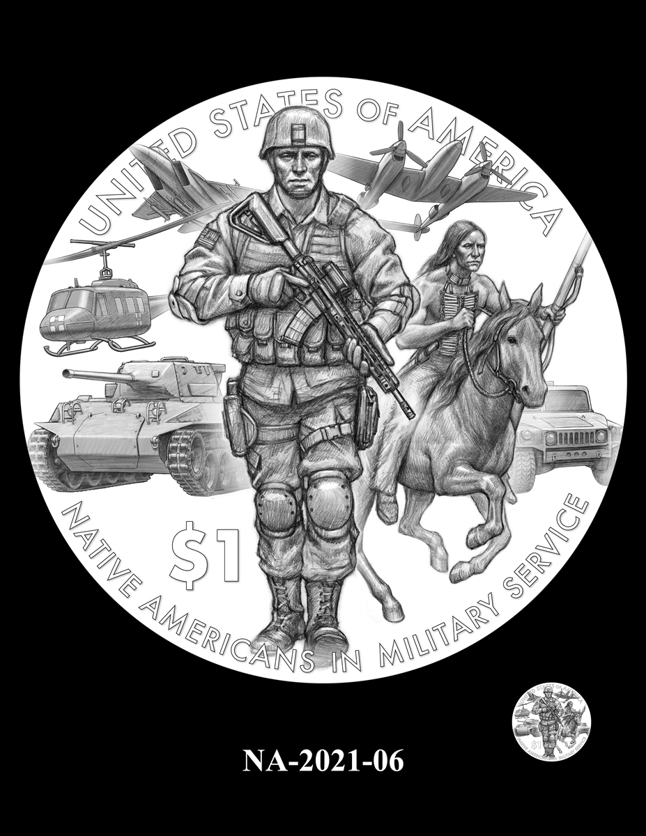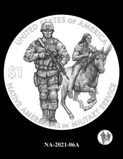 NA-2021-06 features a Native American soldier in contemporary battle gear, a Native American riding bareback, and a variety of military vehicles and aircraft from different eras. These elements identify the contributions of Native Americans not only as fighting soldiers, but also as pilots, gunners, engineers, medics, intelligence officers and other personnel. NA-2021-06A eliminates the vehicles from the composition. Included in both designs is the additional inscription "Native Americans in Military Service."