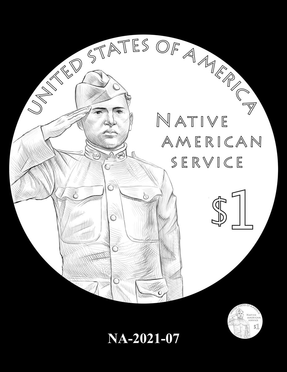 NA-2021-07 depicts a Native American soldier saluting during World War I. Included in the design is the additional inscription "Native American Service."