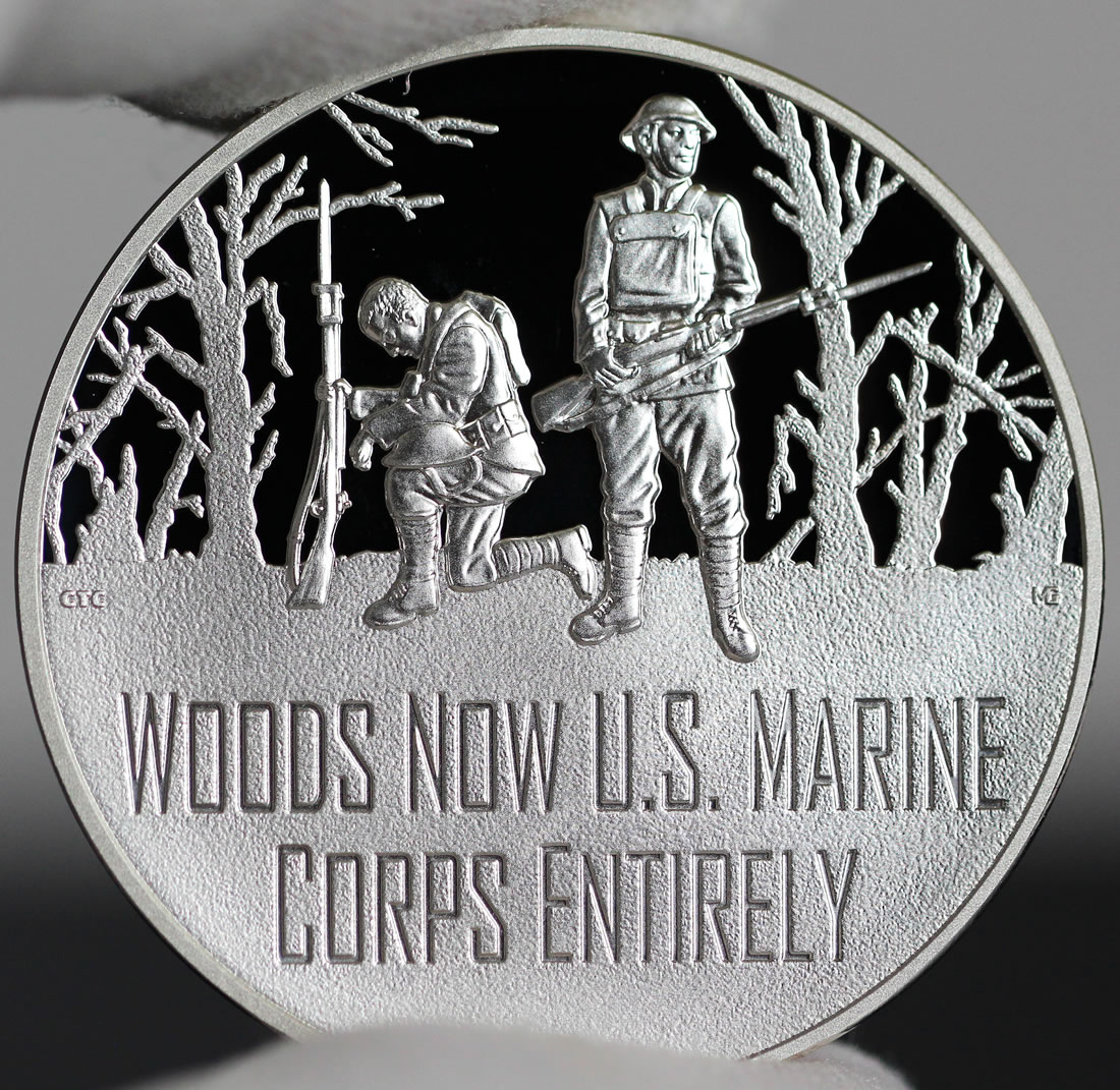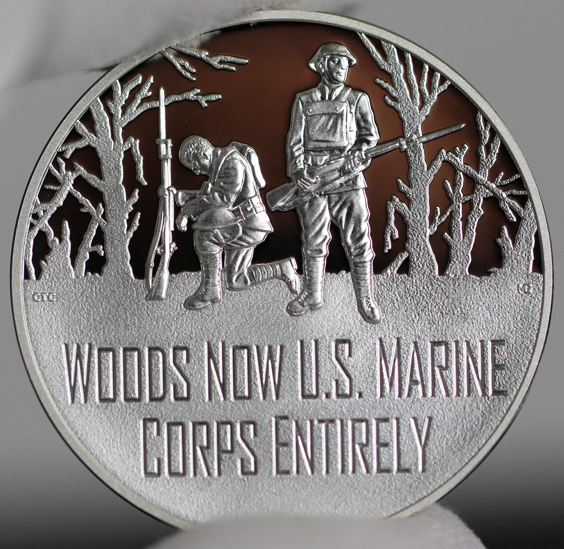 Marine Corps medal obverses show the aftermath of the Battle of Belleau Wood, with one Marine standing guard as the other kneels to pay respect to the fallen. The inscription quotes a report to the American Expeditionary Forces: WOODS NOW U.S. MARINE CORPS ENTIRELY. Chris Costello designed the image and Michael Gaudioso sculpted it.