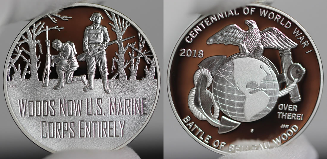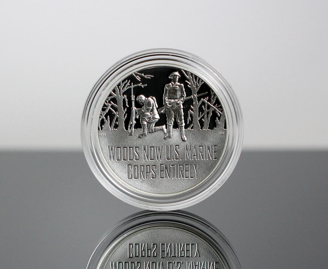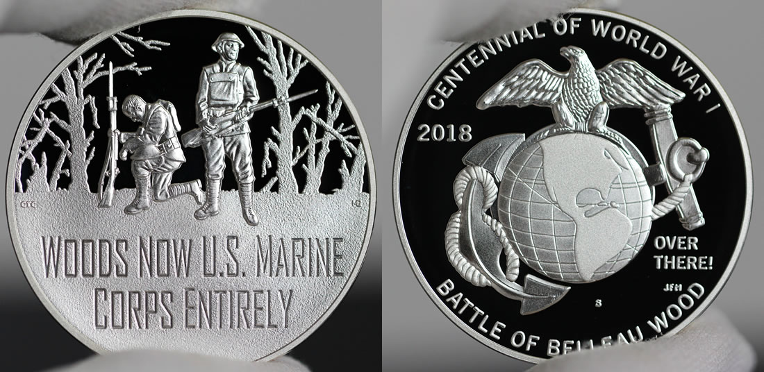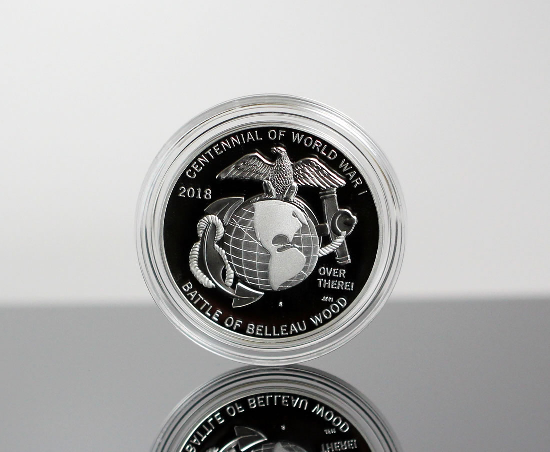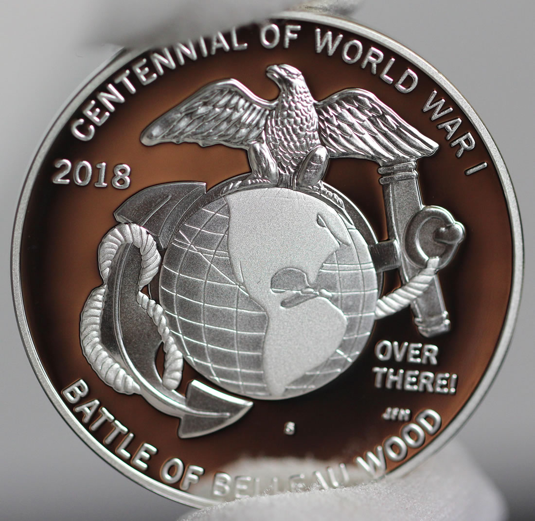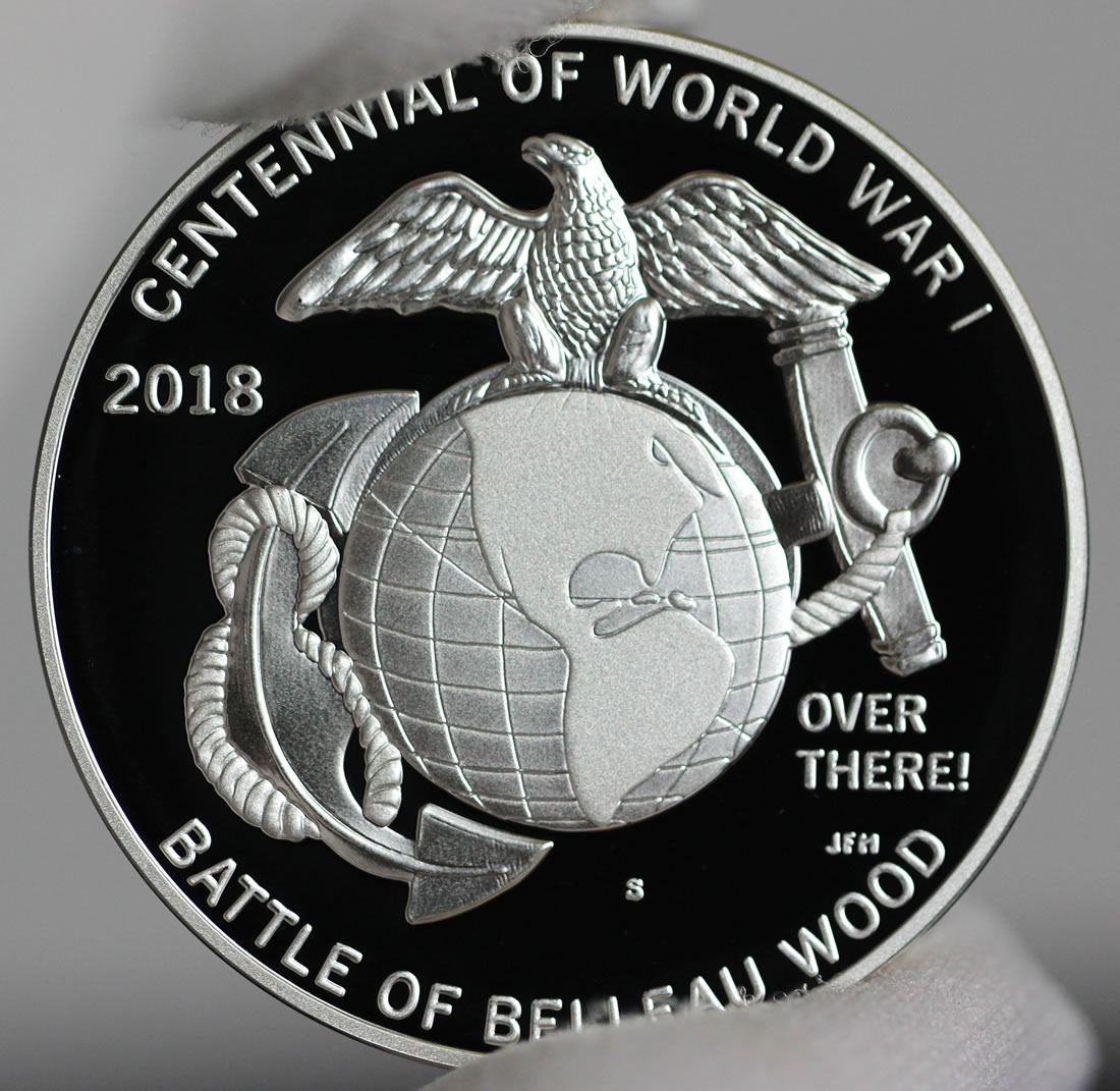 Sculpted by Joseph Menna, reverses feature the World War I-era version of the Eagle, Globe, and Anchor emblem with the inscriptions of CENTENNIAL OF WORLD WAR I, 2018, OVER THERE!, and BATTLE OF BELLEAU WOOD. Produced at the San Francisco Mint, the reverse also has a "S" mint mark.