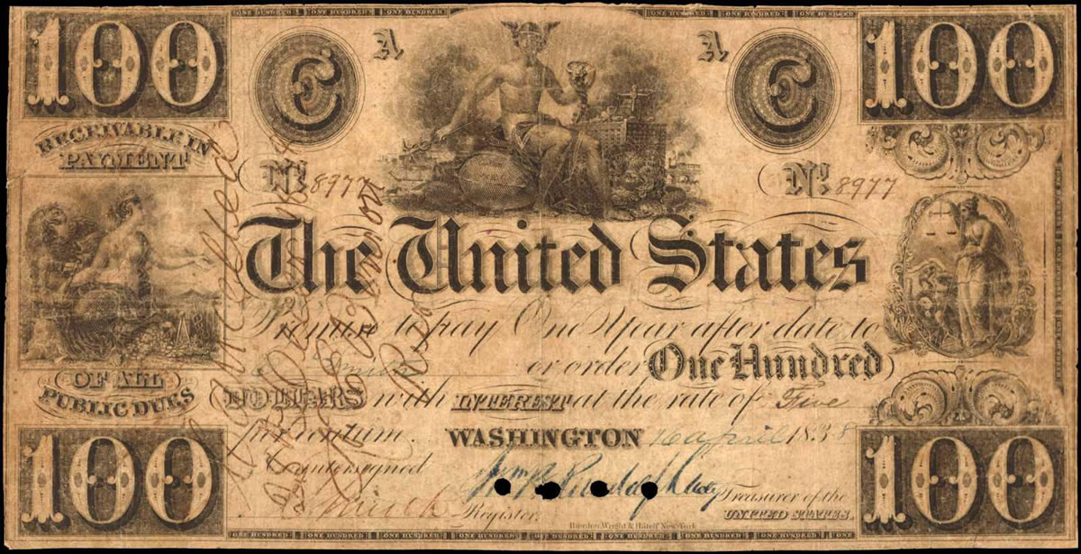 Among other highlights, lot 3016 offered a unique Act of October 12, 1837 $100 Interest Bearing Note, the only known federal note issued between the 1815 Treasury Notes and the Demand Notes of 1861. This example, the only issued note from this early federal series, brought $114,000, over four times the high estimate.