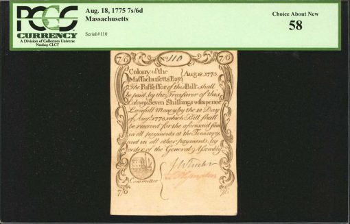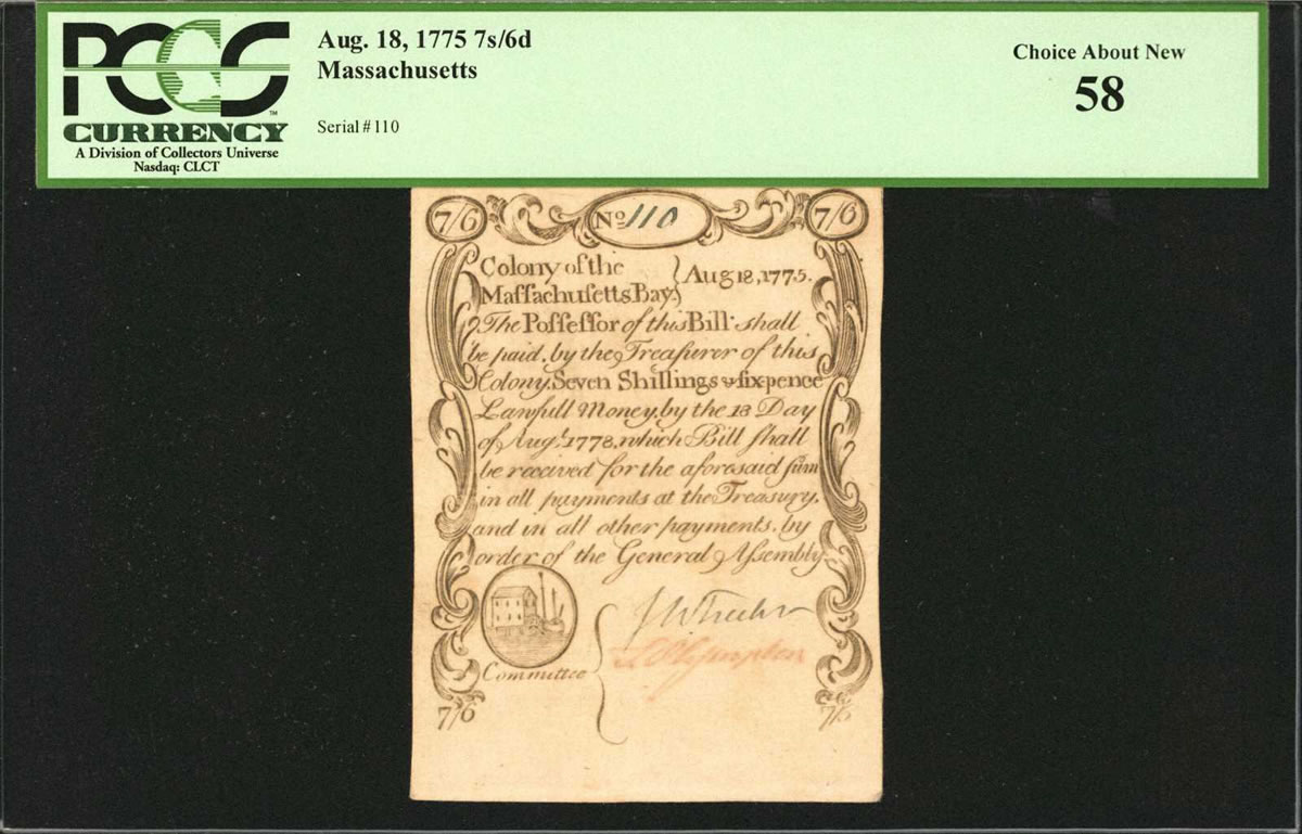 Among colonial currency, a nearly new MA-164 August 18, 1775 7 Shillings 6 Pence "Sword in Hand" note graded Choice About New 58 by PCGS Currency brought $19,200.