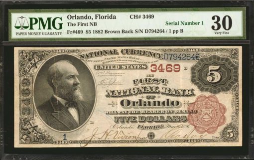 Also notable was a new-to-the-market serial number 1 $5 Brown Back from the First National Bank of Orlando, Florida graded Very Fine 30 by PMG. It crossed the block for $30,000.