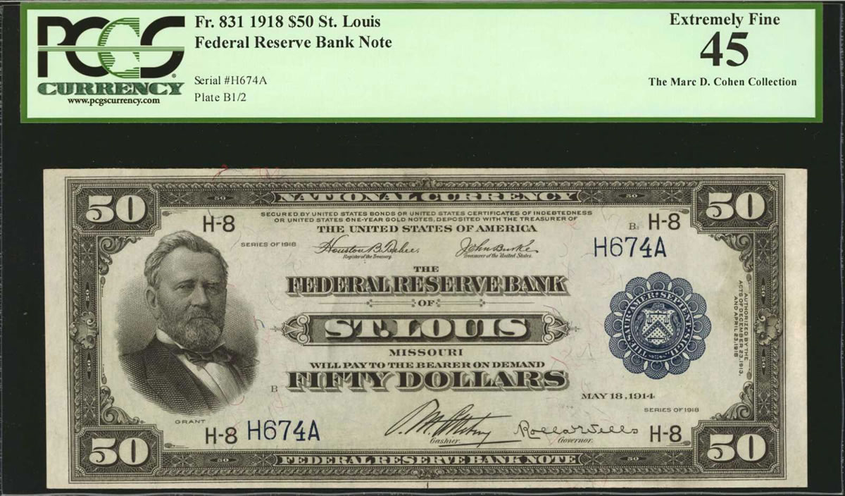 Among large size notes, a PCGS Currency Extremely Fine 45 graded Fr. 831 $50 Federal Reserve Bank Note from St. Louis realized $30,000, while, $26,400 was the high bid for a PCGS Currency Very Choice New 64 PPQ graded Fr.127 1869 $20 "Rainbow" Legal Tender Note.