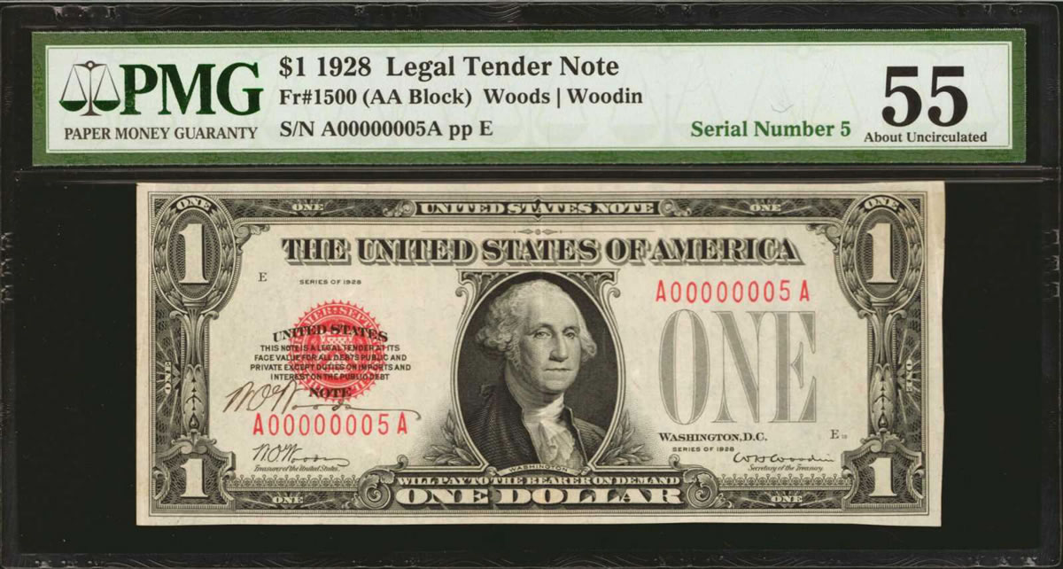 Also worthy of mention is a serial number 5 Fr.1500 1928 $1 Legal Tender Note graded About Uncirculated 55 by PMG. This new discovery, which had been presented to Olga Hirsch by Treasurer N.O. Woods, sold for $21,600.