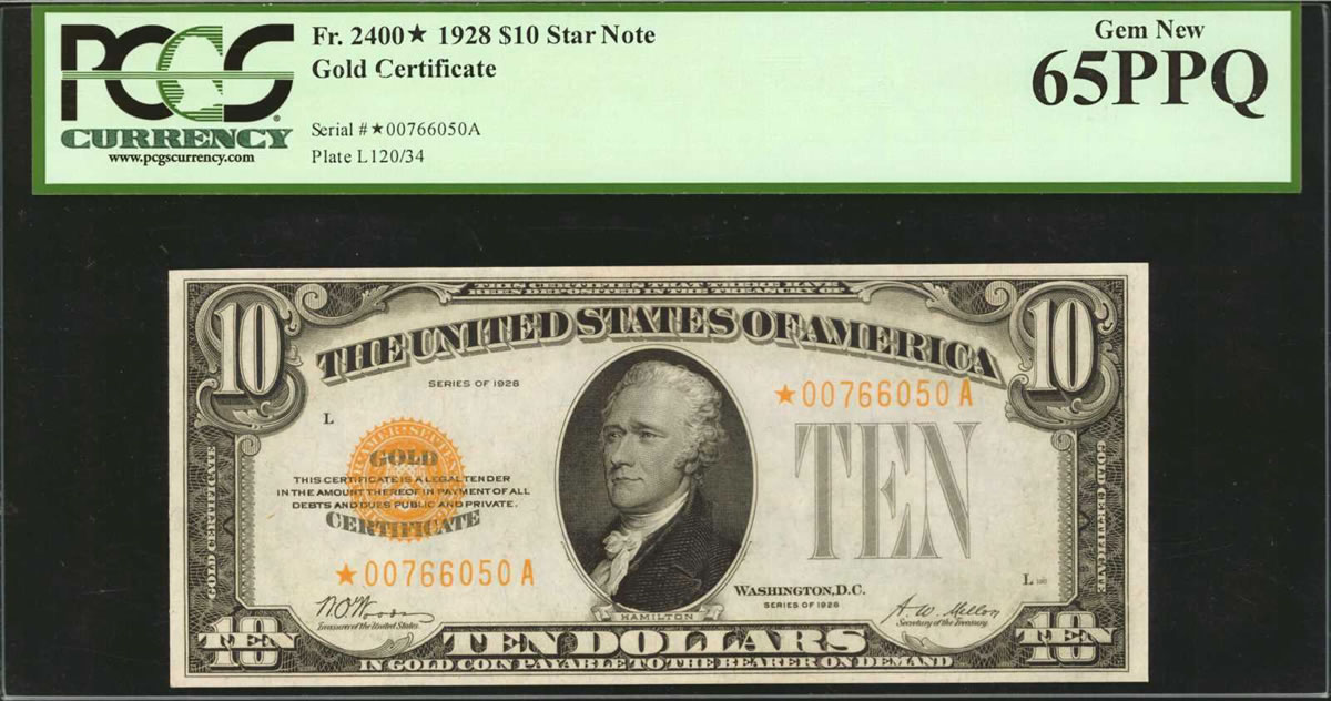 Small size currency was highlighted by a scarce replacement note, a Fr.2400* 1928 $10 Gold Certificate. Graded Gem New 65 PPQ by PCGS Currency this example sold for $28,800.