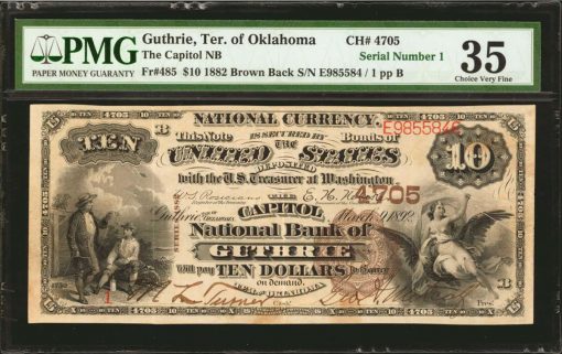 In addition to these specialized catalogs, Stack’s Bowers Galleries also presented live and Internet sessions featuring a diverse array of United States paper money. National banknotes were again a key attraction, and included a newly discovered serial number 1 1882 $10 Brown Back from the Capitol National Bank of Guthrie, Oklahoma. This note, graded Choice Very Fine 35 by PMG, realized $33,600.