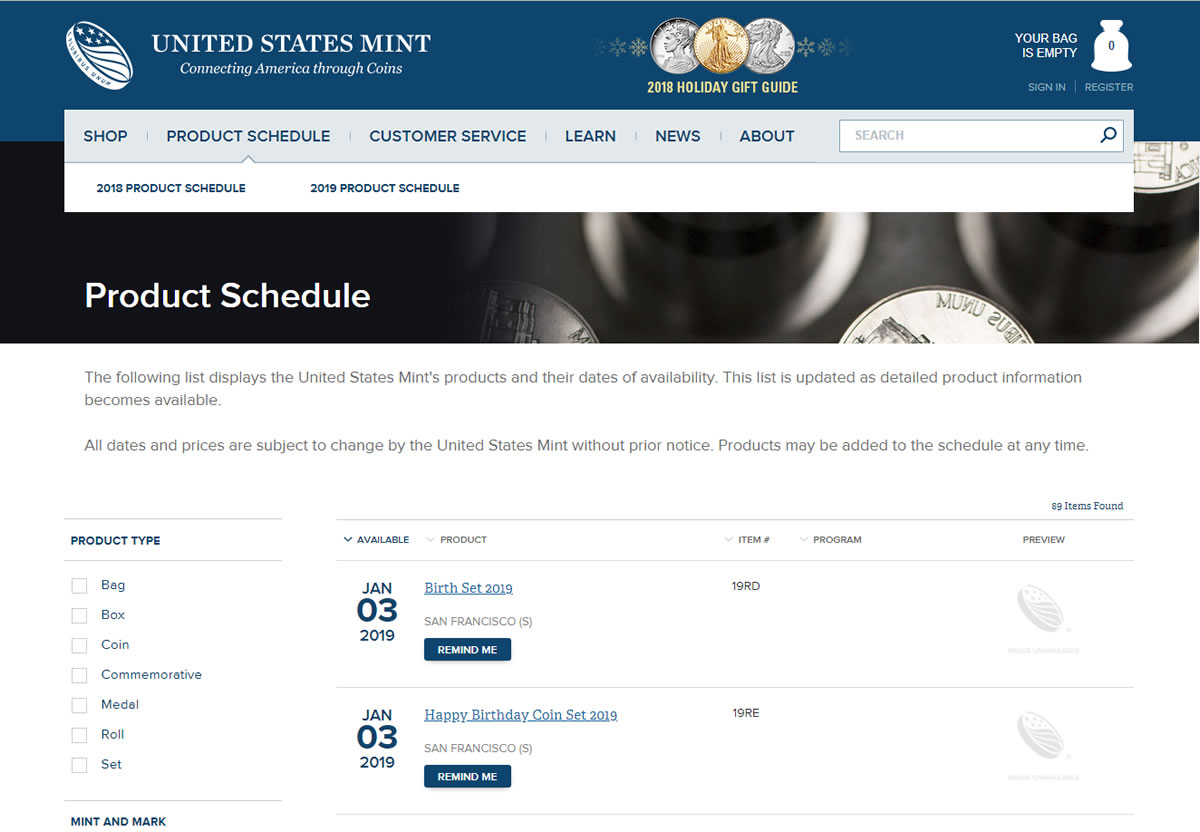 For the latest listings, visit the U.S. Mint’s product schedule for 2019.