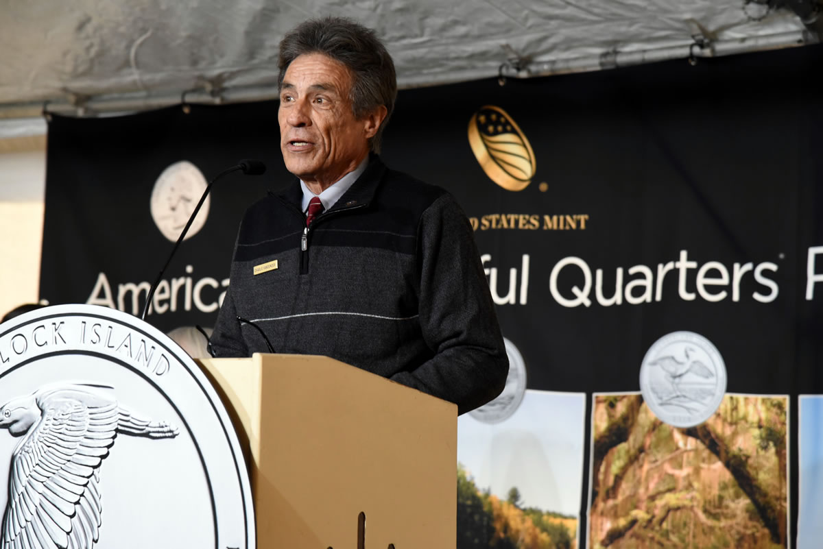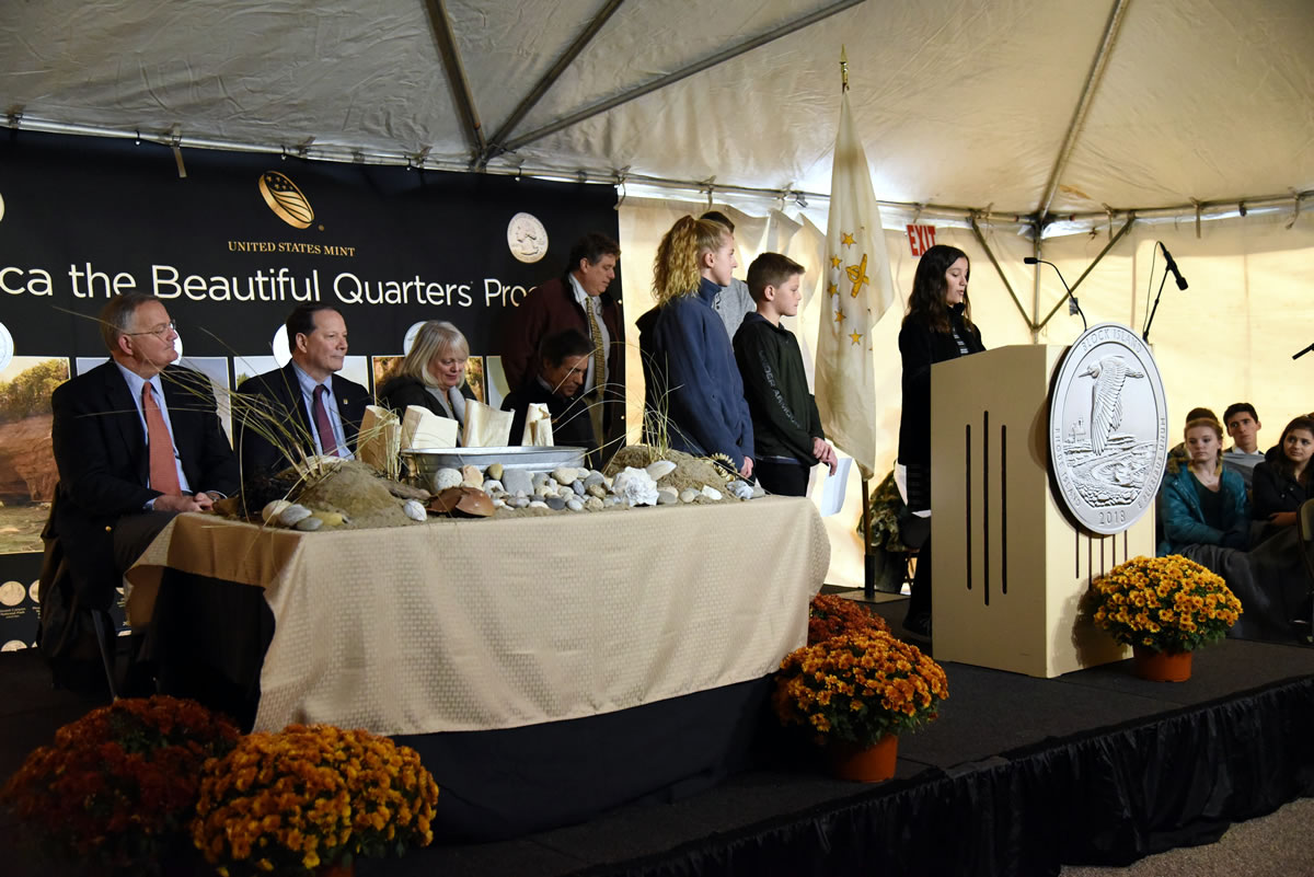 A crowd of around 325 people, including about 100 schoolchildren, attended the outside tent event which was hosted by officials from the U.S. Mint and U.S. Fish and Wildlife Service. Kids aged 18 and under received a free Block Island quarter to commemorate the ceremony.