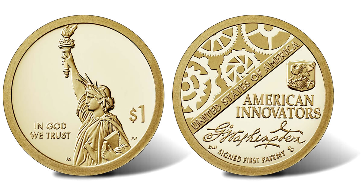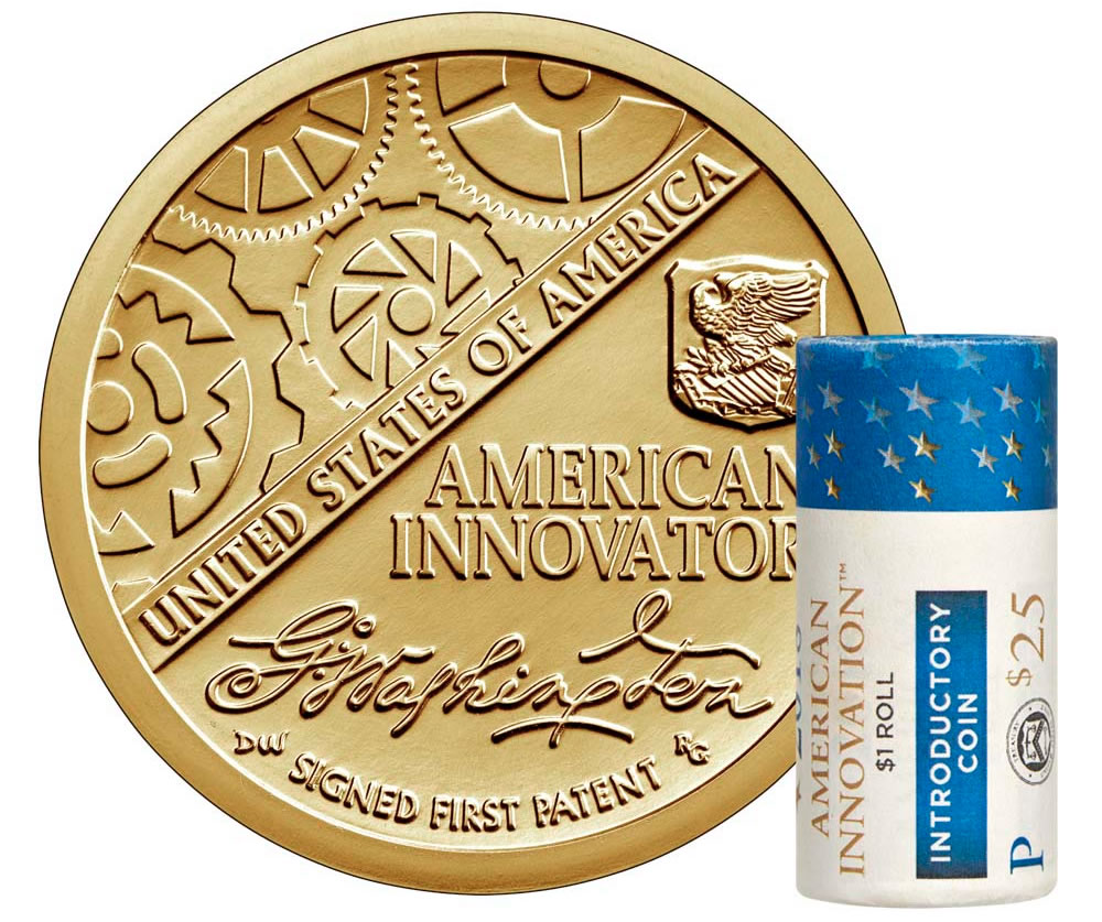 Upcoming dollar reverses (tails side) will be unique to the innovation or innovators honored from each location. This year’s dollar introduces the series with a reverse paying homage to President George Washington whose signature is on the first-ever U.S. patent issued on July 31, 1790. In addition to Washington’s signature, there are stylized gears representing industry and innovation, and a privy mark-like collage showing an eagle atop tools within a shield. Donna Weaver crafted the image and Renata Gordon sculpted it.