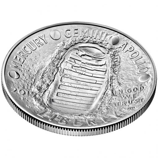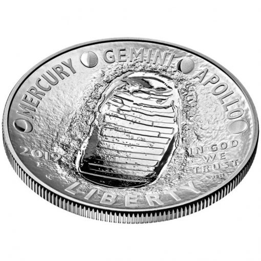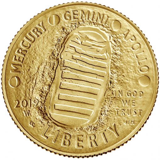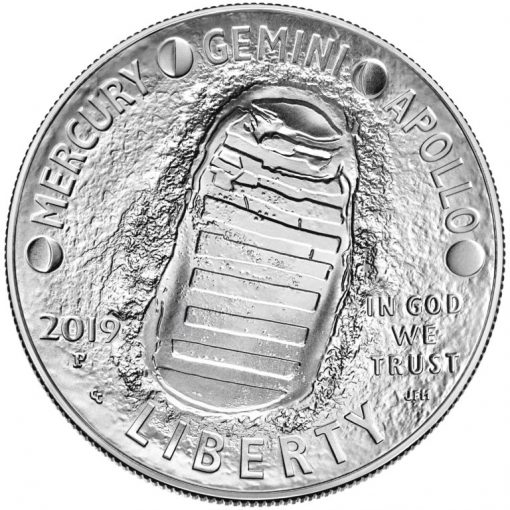 Gary Cooper’s artwork won from among candidates unveiled in October 2017. Engraved by Joseph Menna, it features the inscriptions "MERCURY," "GEMINI," and "APOLLO," separated by phases of the Moon, and a footprint on the lunar surface. Additional inscriptions include "2019," "IN GOD WE TRUST," and "LIBERTY."