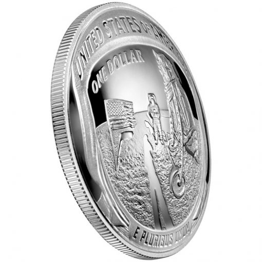 Each coin also has a common reverse. The general design was outlined in Public Law 114-282 with candidates reviewed in June 2017. Engraved by Phebe Hemphill, it depicts a representation of a close-up of the famous ‘Buzz Aldrin on the Moon’ photograph taken July 20, 1969, that shows just the visor and part of the helmet of astronaut Buzz Aldrin.