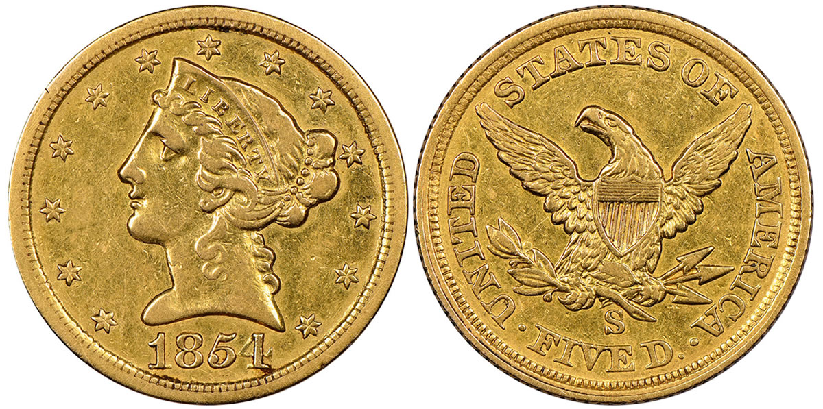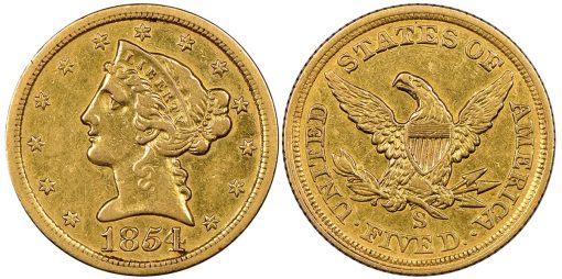 $2,160,000 by Heritage Auctions for the recently discovered fourth known 1854 San Francisco Mint Half Eagle ($5 denomination gold coin), graded NGC Extremely Fine 45;