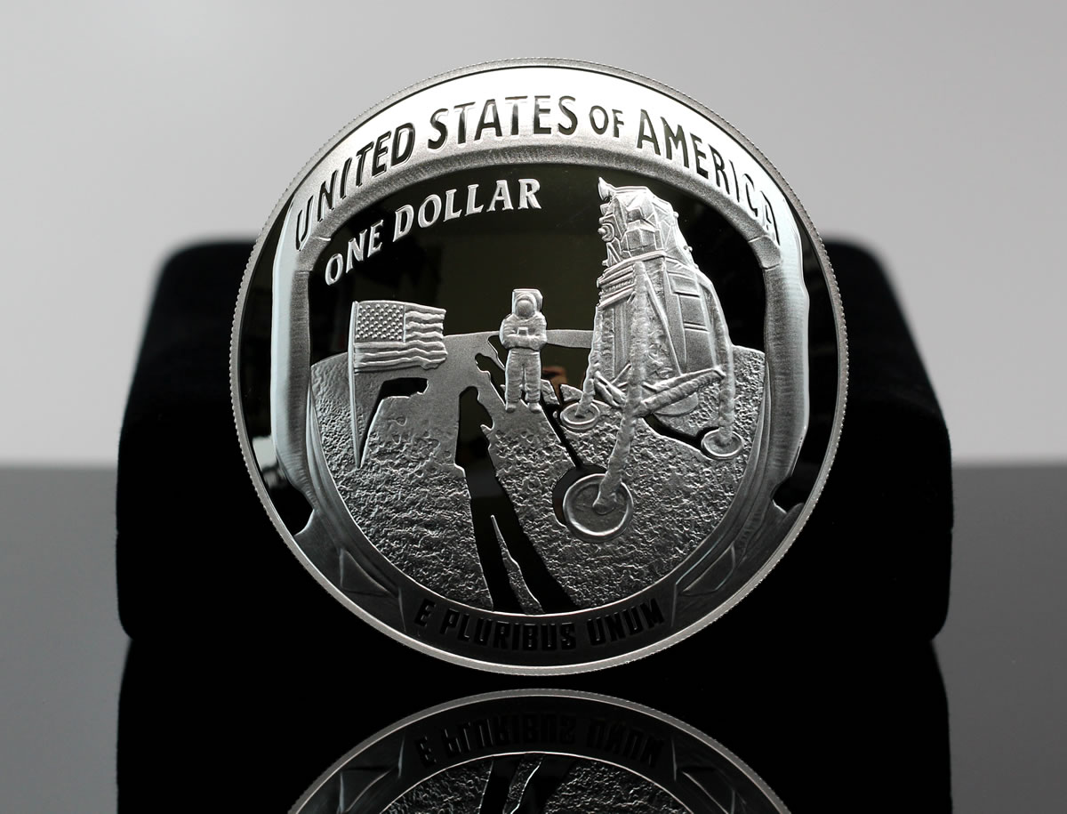 As directed by the commemoratives’ authorizing act, Public Law 114-282, coin prices include surcharges of $35 per gold coin, $10 per silver dollar, $5 for each half-dollar, and $50 for each five-ounce silver coin. The collected funds will be distributed between the Smithsonian Institution’s National Air and Space Museum’s Destination Moon exhibition; the Astronauts Memorial Foundation; and the Astronaut Scholarship Foundation.