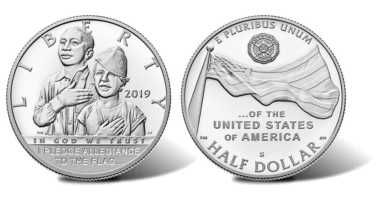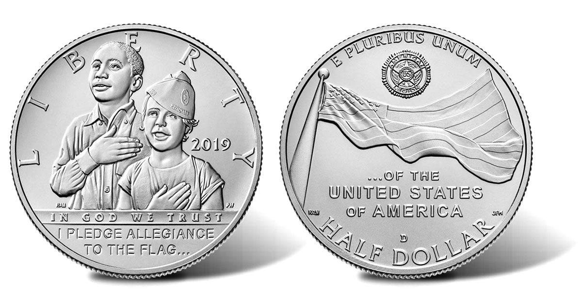 Found on clad half dollar obverses is a design depicting two children standing and reciting the Pledge of Allegiance. The little girl is shown wearing what is said to be her grandfather’s old American Legion hat. Inscriptions include "LIBERTY," "2019," "IN GOD WE TRUST," and "I PLEDGE ALLEGIANCE TO THE FLAG…" Richard Masters designed the obverse and Phebe Hemphill sculpted it.