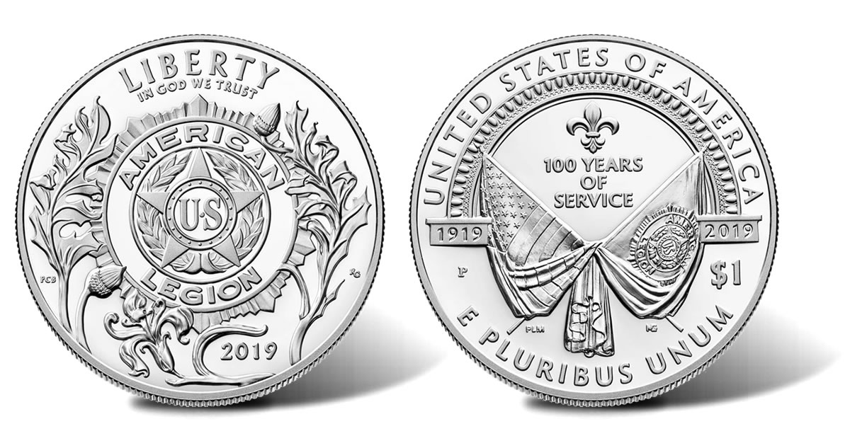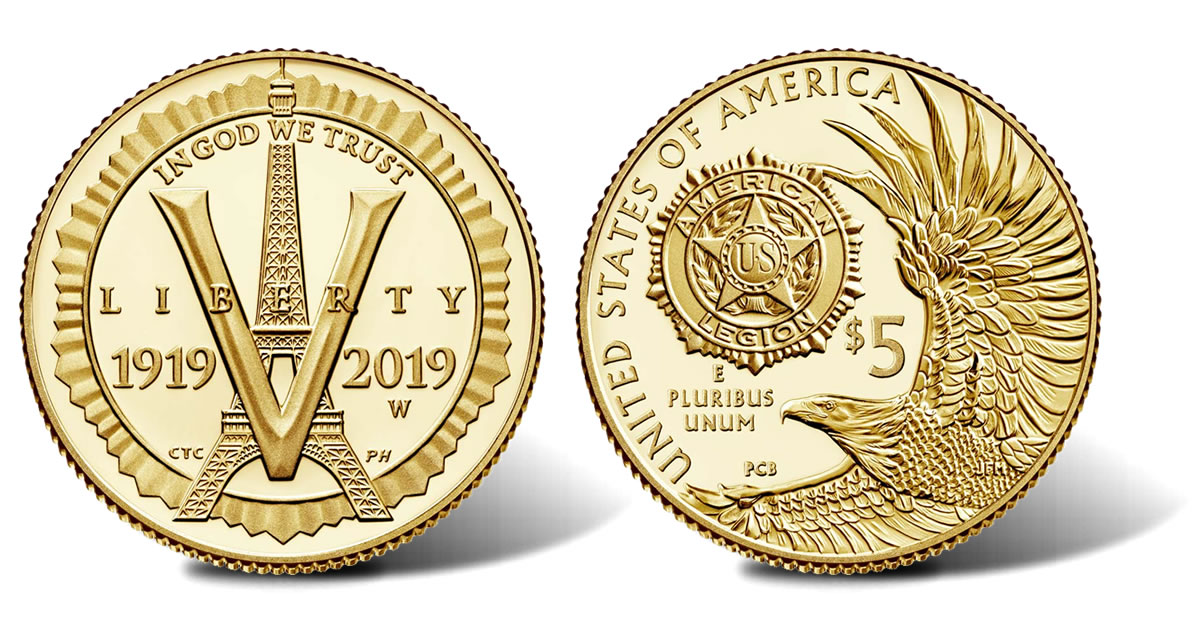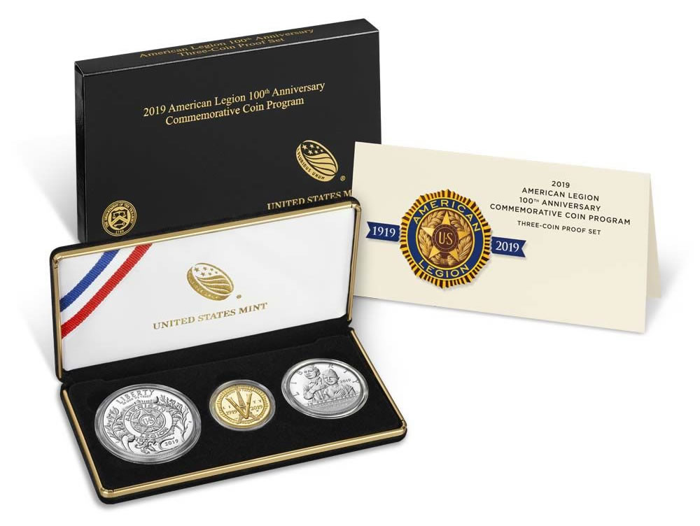 Options include $5 gold coins, silver dollars and clad half-dollars in proof and uncirculated collector finishes and a three-coin proof set holding one of each denomination. All are issued under the American Legion 100th Anniversary Commemorative Coin Act (Public Law 115-65) to recognize the American Legion’s centennial.