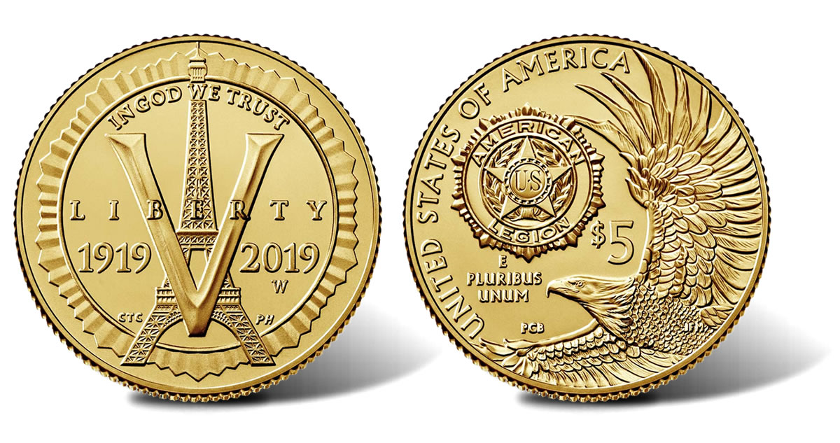 Appearing on the $5 gold coin obverse (heads side) is an image marking the inception of the American Legion and its mission to serve America and its war veterans. It includes an outer geometric rim design from the American Legion emblem, the Eiffel Tower, and V for victory. Inscriptions read "IN GOD WE TRUST," "LIBERTY," "1919," and "2019." Chris Costello designed the image and Phebe Hemphill sculpted it.