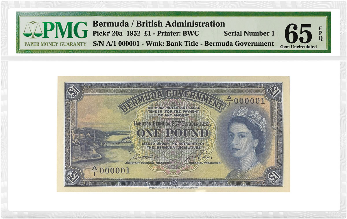 Among the highlights in the notes recently certified by PMG is a Bermuda 1952 One Pound note, with a portrait of Queen Elizabeth II at right, issued in the year she ascended to the throne. The note, a Serial Number 1, is graded PMG 65 Gem Uncirculated EPQ.