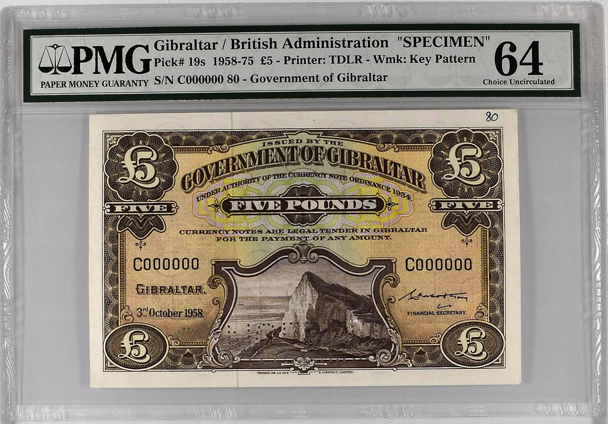 Another rare note is a Gibraltar 1958-75 Five Pound Specimen, graded PMG Choice Uncirculated 64. The note shows the famous Rock of Gibraltar, part of the strategically important British Overseas Territory at the western edge of the Mediterranean Sea.