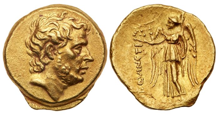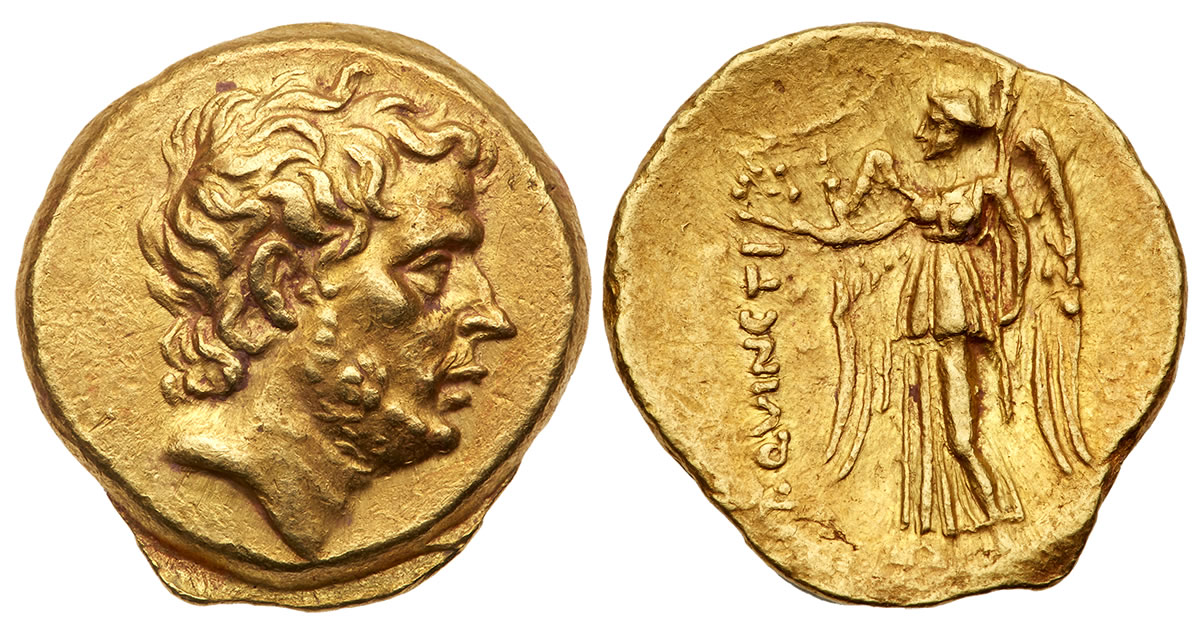 T. Quinctius Flamininus gold Stater, ca. 196 B.C., of the first living person to be depicted on a Roman coin. This nearly Mint State example is considered the finest of only eight known.