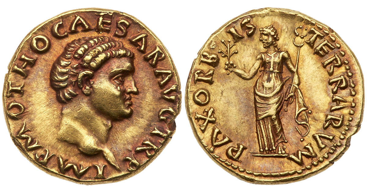 Otho gold Aureus. He reigned only from January — April 69 AD. Struck at Rome and perhaps the most difficult of the 12 Caesars to obtain in choice condition. The Tyrant Collection coin is a superb, nearly Mint State specimen. Ex Metropolitan Museum, New York, and ex Boscoreale Hoard, 1895.