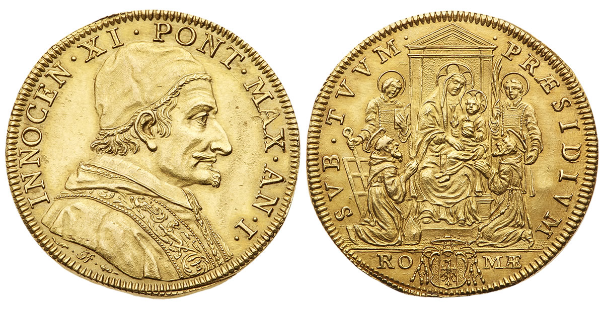 Pope Innocent XI, extremely rare Quadruple Scudi d’oro, Nearly Mint State. Born Benedetto Odescalchi, his papacy was from 1676 to 1689. He is known in Budapest as the "Savior of Hungary," and much of his reign was concerned with tension with Louis XIV of France.