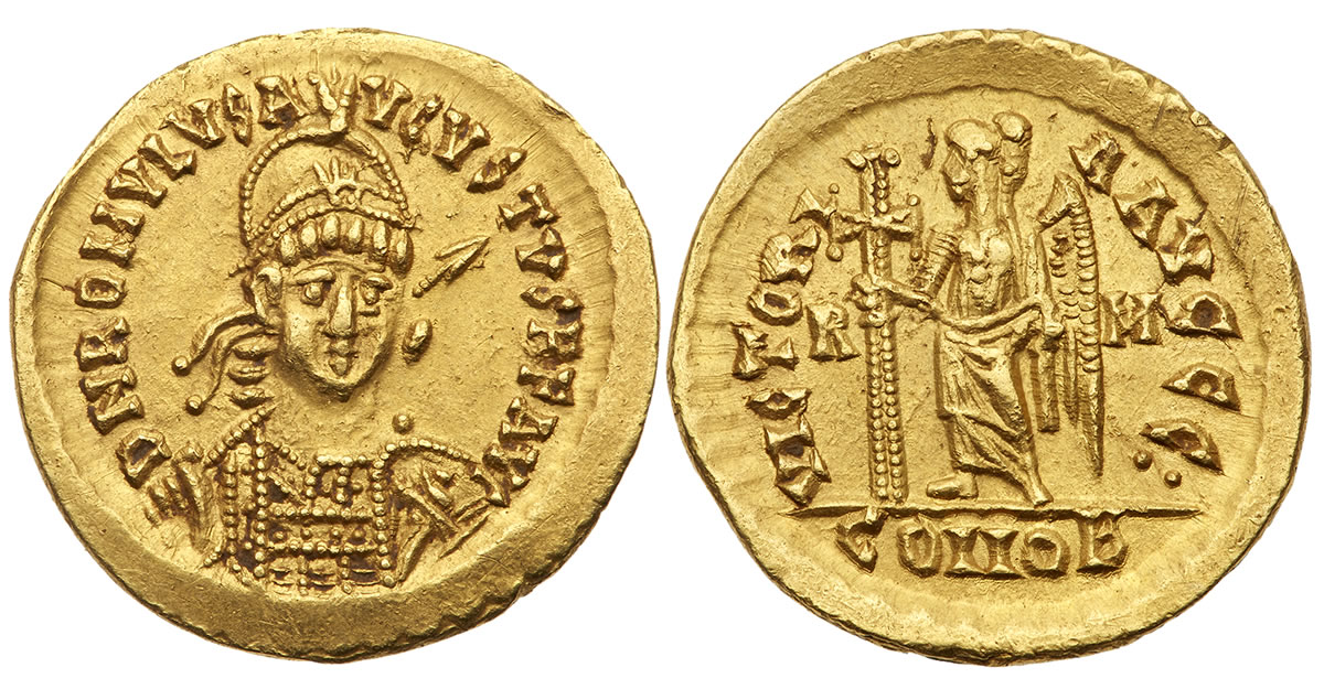 Romulus Augustus, October 31 — September 476 AD, gold Solidus of Rome depicting the last line of Roman emperors in the West. All the coinage of Romulus Augustus is scarce and the gold solidi are extremely rare. This nearly Mint State specimen is probably the finest in existence.