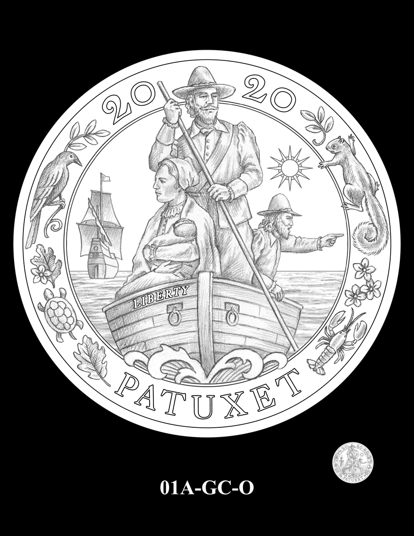 01A-GC-O presents the same composition with a border depicting flora and fauna native to "Patuxet," the Wampanoag name for the Plymouth, Massachusetts area where the Mayflower arrived. Inscriptions are "2020," "LIBERTY," and "PATUXET."