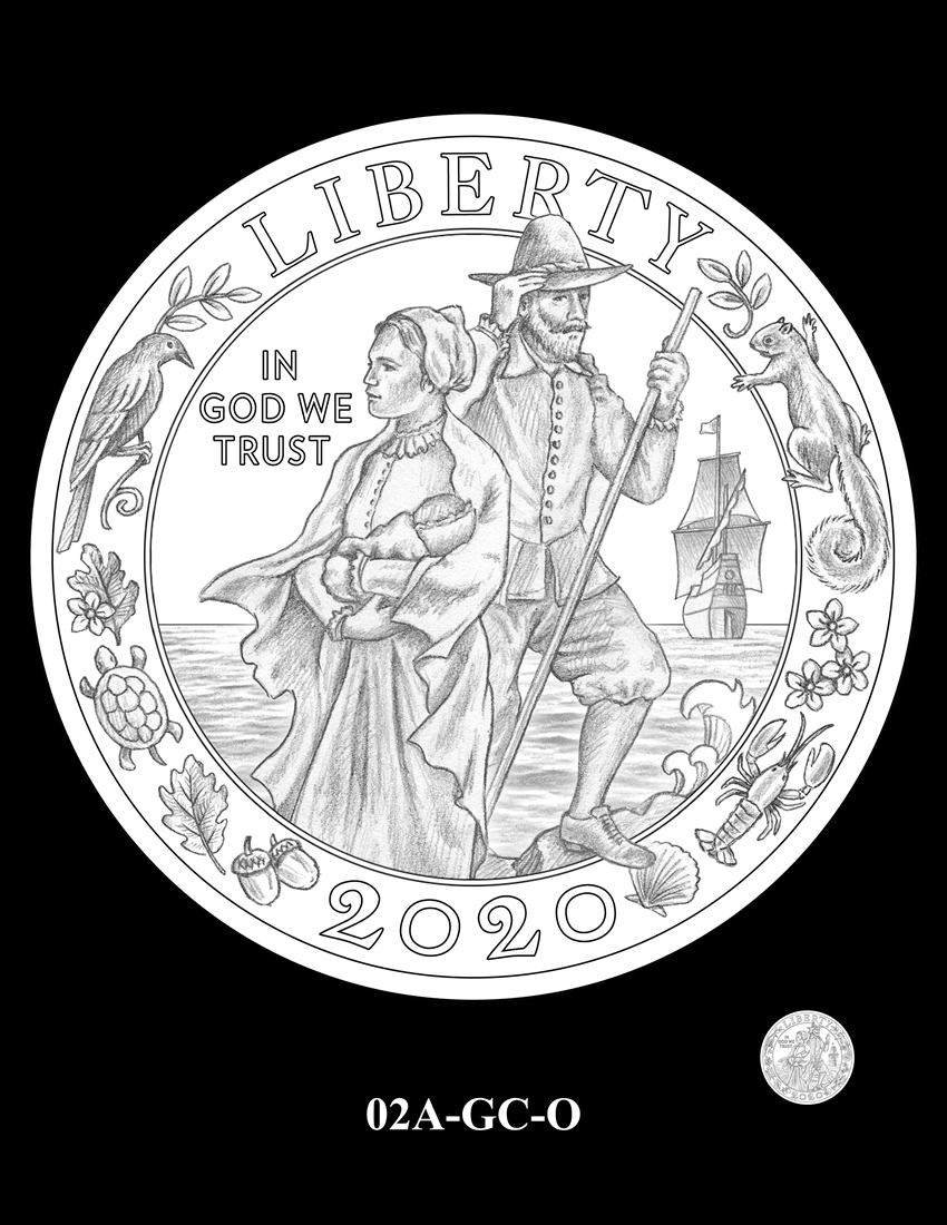 02A-GC-O features the same composition surrounded by local flora and fauna on the border, representing the homeland of the Wampanoag people. Inscriptions are "LIBERTY," "IN GOD WE TRUST," and "2020."