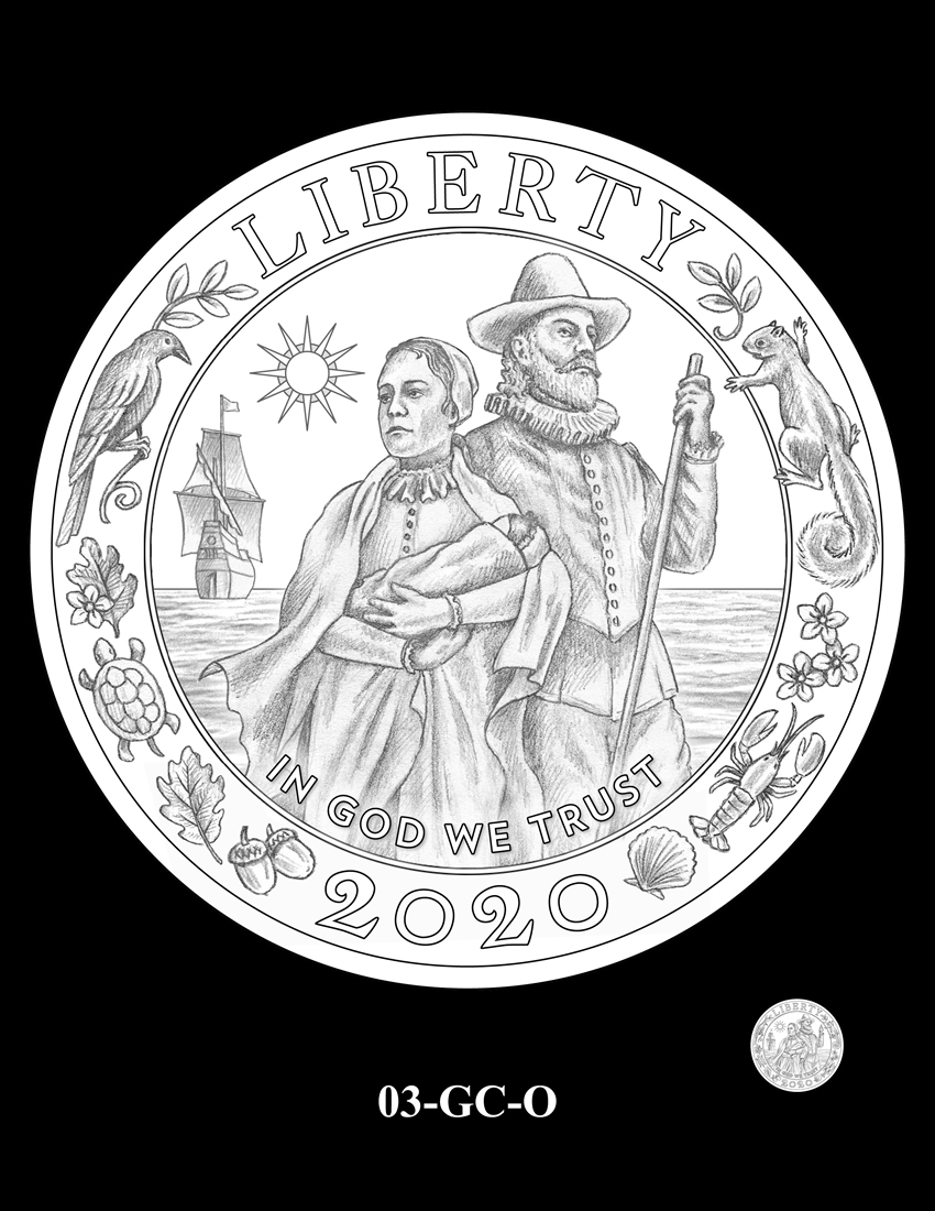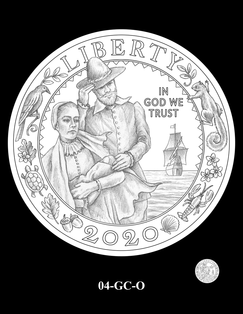 04-GC-O features a Mayflower family bracing against the cold and windy weather, foreshadowing their coming hardships, while the Mayflower is anchored in the harbor. The local flora and fauna on the border, along with a Wampanoag triangle design represent the Wampanoag homeland. Inscriptions are "LIBERTY," "IN GOD WE TRUST," and "2020."