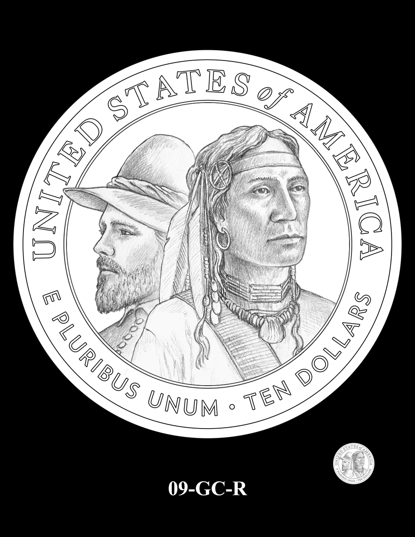 09-GC-R features a Pilgrim and a Wampanoag Indian, depicted back to back in dignified and powerful portraits. They partner in cooperation, yet face away from each other with differing visions, agendas, and futures. Inscriptions are "UNITED STATES OF AMERICA," "E PLURIBUS UNUM," and "FIVE DOLLARS."