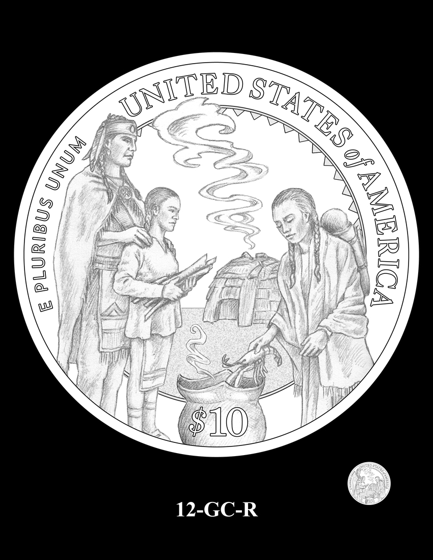 12-GC-R depicts a Wampanoag family during the course of their daily activities. A traditional Wetu home is in the background with the smoke from its central fire rising through an opening in the roof. Inscriptions are "UNITED STATES OF AMERICA," and "E PLURIBUS UNUM."
