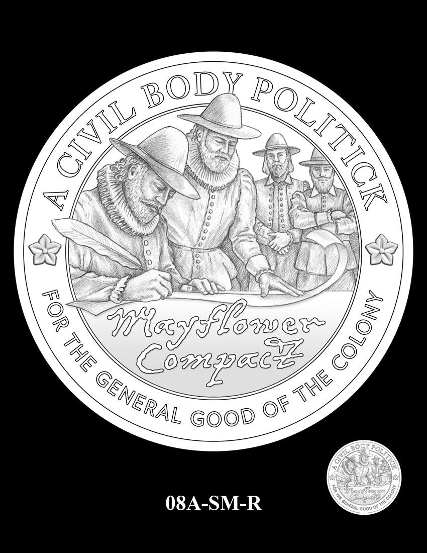 08A-SM-R uses the same composition, formatted as a medal with the inscriptions "A CIVIL BODY POLITICK," and "FOR THE GENERAL GOOD OF THE COLONY," excerpts from the Mayflower Compact.