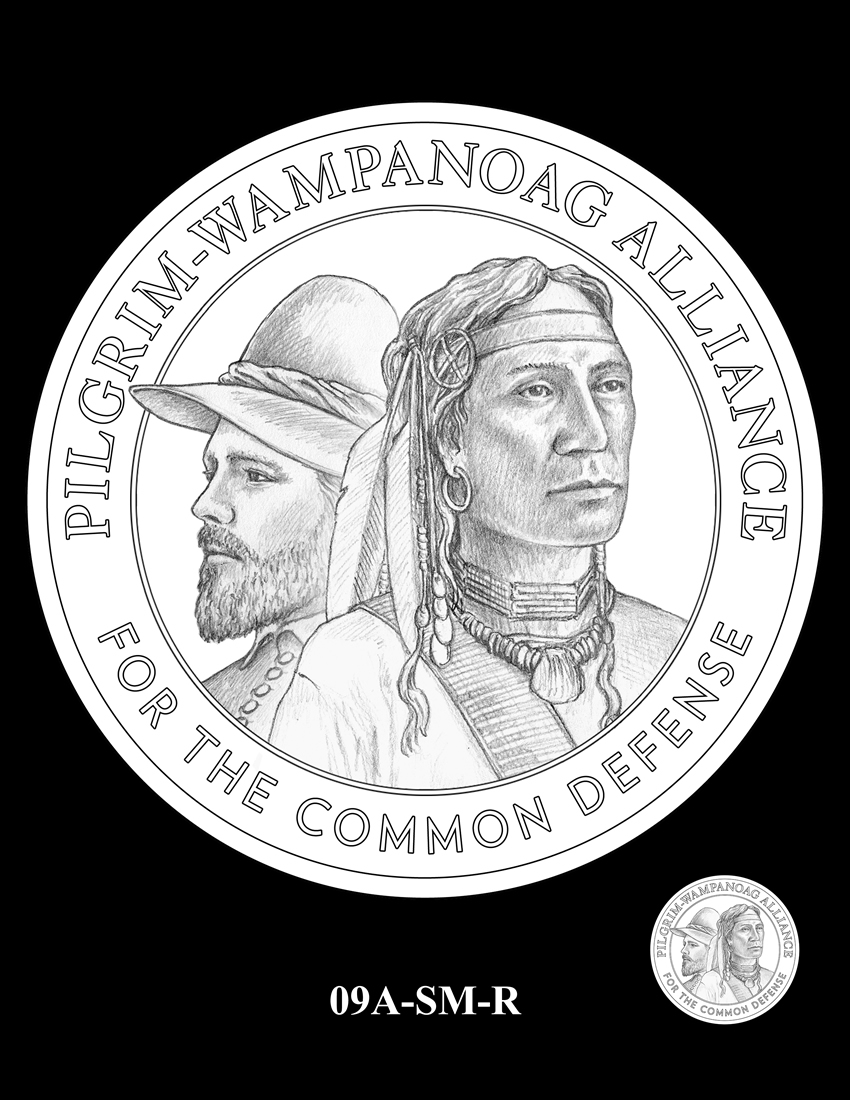 09A-SM-R formats the same composition as a medal and incorporates the inscriptions "PILGRIM-WAMPANOAG ALLIANCE," and "FOR THE COMMON DEFENSE," the primary reason for the alliance.
