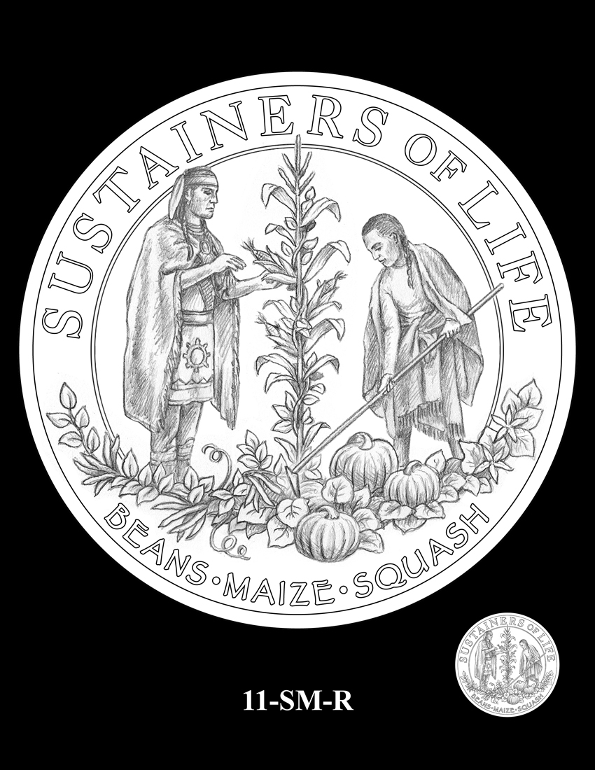 11-SM-R depicts a Wampanoag man and woman employing a planting technique used to grow several crops that were staples for the Wampanoag people. This method helped keep the soil healthy, maintaining the resources for annual plantings and successful harvests. The inscription "SUSTAINERS OF LIFE" recalls not only this sustainable planting technique but the critical skills the Wampanoag people afforded to the Pilgrims by teaching them how to successfully plant and harvest the land. The additional inscriptions of "BEANS," "MAIZE," and "SQUASH" are arced across the bottom border.