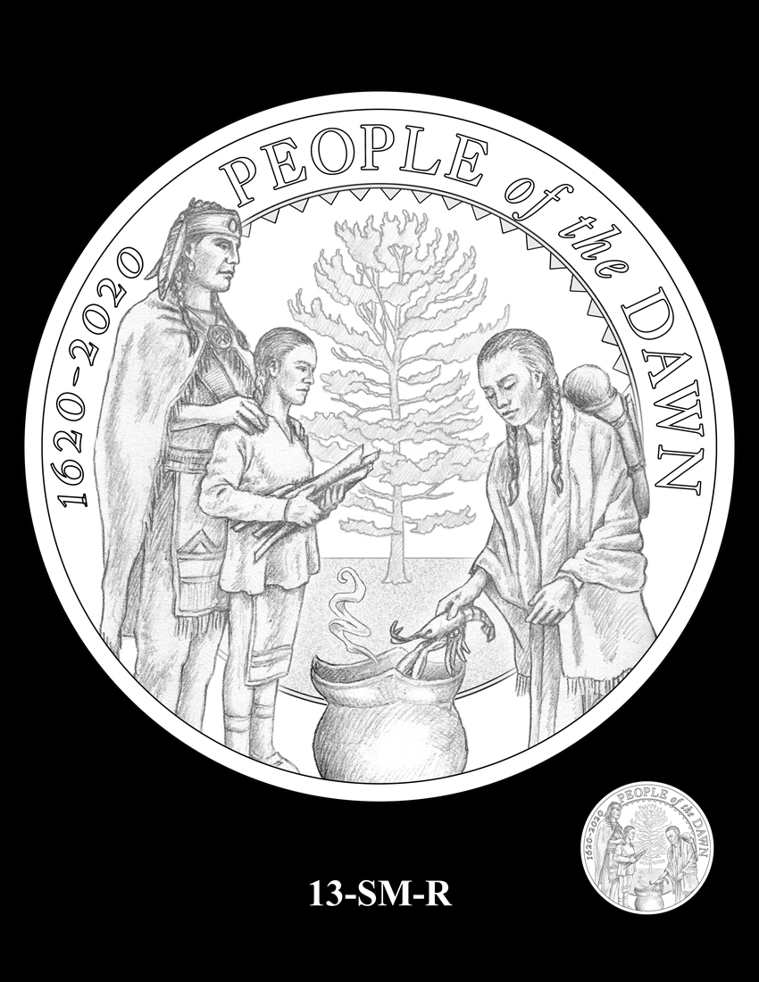 05C-SM-R, formatted as a medal reverse, incorporates the inscriptions "PEOPLE OF THE DAWN," and "1620-2020."