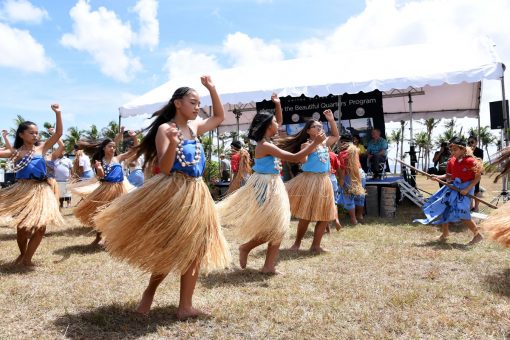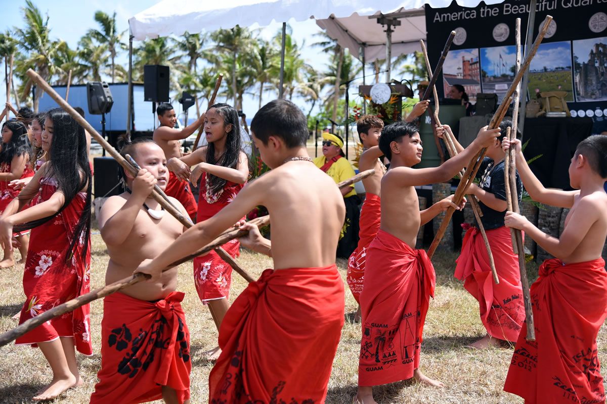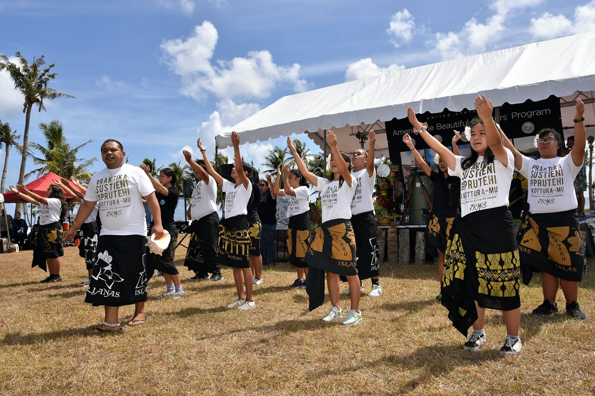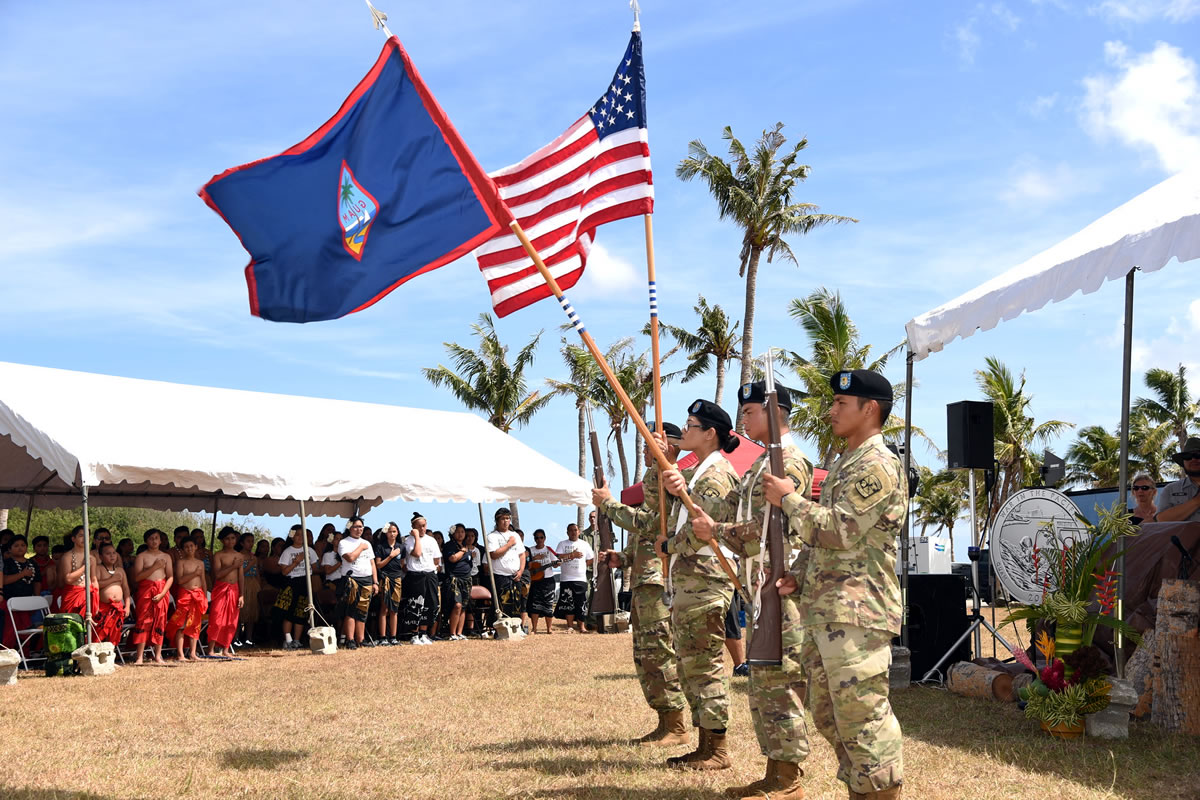 Other ceremony highlights included the presentation of colors by the University of Guam Army ROTC Honor Guard and performances by the Aniten I Taotao Tano’ Cultural Dance Group from Talofofo Elementary School, the Students from Oceanview Middle School’s Guma’ Nina’en Åcho’ Latte, and the Jose Rios Middle School Cultural Club Guma Kinalamten I Taotao Tano’.