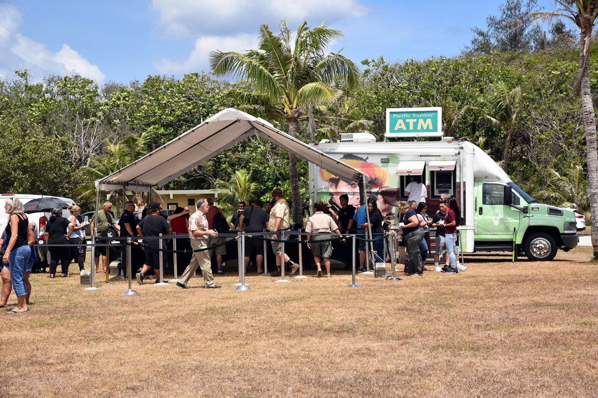 Many of those who attended the launch ceremony took part in the traditional coin exchange with about $16,000 in D-mint mark War in the Pacific Park quarters swapped for cash. The quarters were provided by Bank of Guam.
