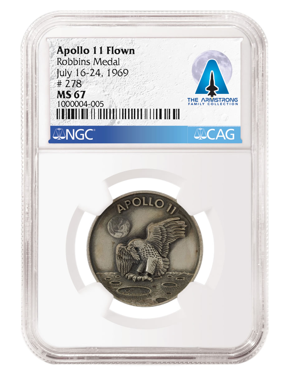 A pair of Apollo 11 Silver Robbins Medals that were flown on the mission each realized $50,000. The medals, which feature the mission insignia and the launch, moon landing and splashdown dates, were graded MS 66 by Numismatic Guaranty Corporation® (NGC). Two other Apollo 11 Silver Robbins Medals that were flown on the mission, graded NGC MS 65 and NGC MS 67, realized $40,000 each. An affiliate of CAG, NGC has graded more than 43 million coins, medals and tokens.