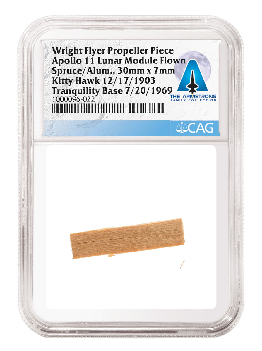 The top lots in this sale were a piece of the propeller and a piece of the wing fabric, each realizing $175,000. Two other propeller pieces realized $125,000 and $112,500, while another wing fabric piece realized $106,250. All of the Wright Flyer pieces were certified by CAG and encapsulated in tamper-evident, protective holders with a label that bears the dates of the two important events: "Kitty Hawk 12/17/1903" and "Tranquility Base 7/20/1969."